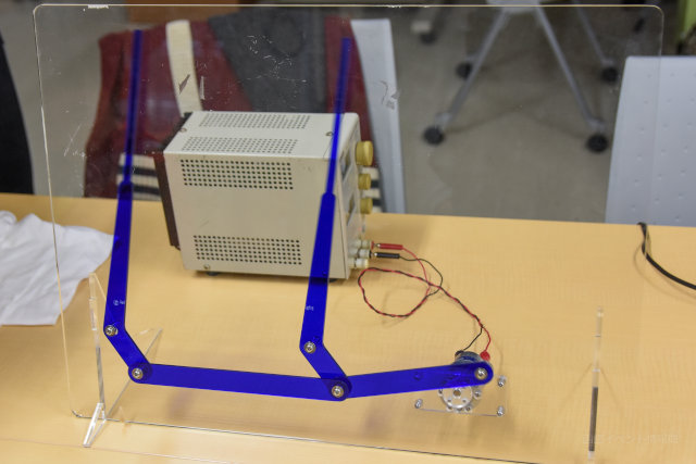 こちらもおもしろかった展示。車のワイパーが動く仕組みを再現してみせてくれます。2本のワイパーが1個のモーターの回転で動くとは、今まで考えもしませんでした……
