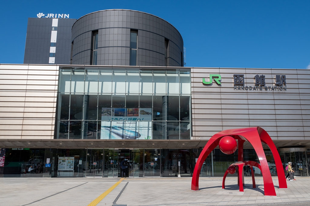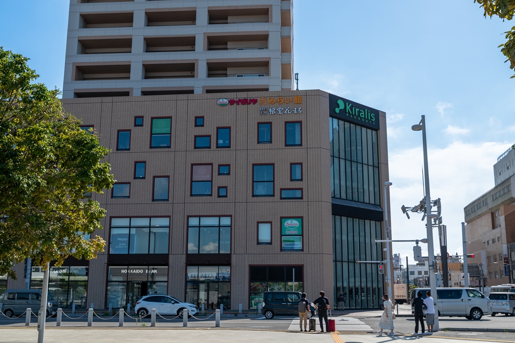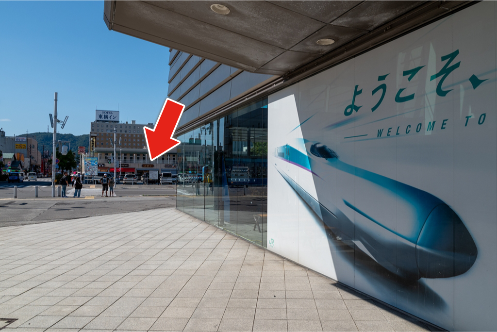函館駅を背にすると真正面に見えるビルです。信号をひとつ渡りますが、まっすぐ歩くだけなので迷うことはありません。徒歩3分で着きます。