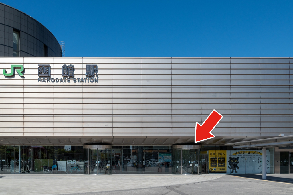 函館駅改札を出たらまっすぐ進み、外に出る自動ドアの直前で左を向いてください。上と下に「函館市観光案内所」の表示、右下に「ヤマト運輸」の立て看板があります。自動ドアを通って一番奥まで進んでください。
