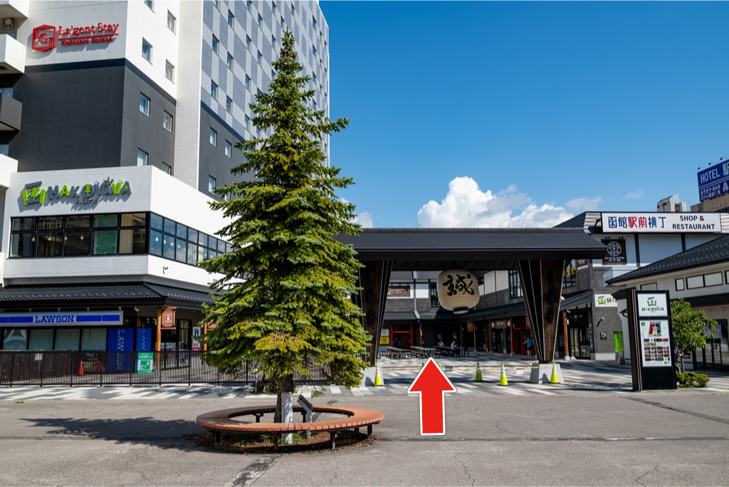 函館駅の外からなら、矢印の入口から入るとすぐ目の前です。