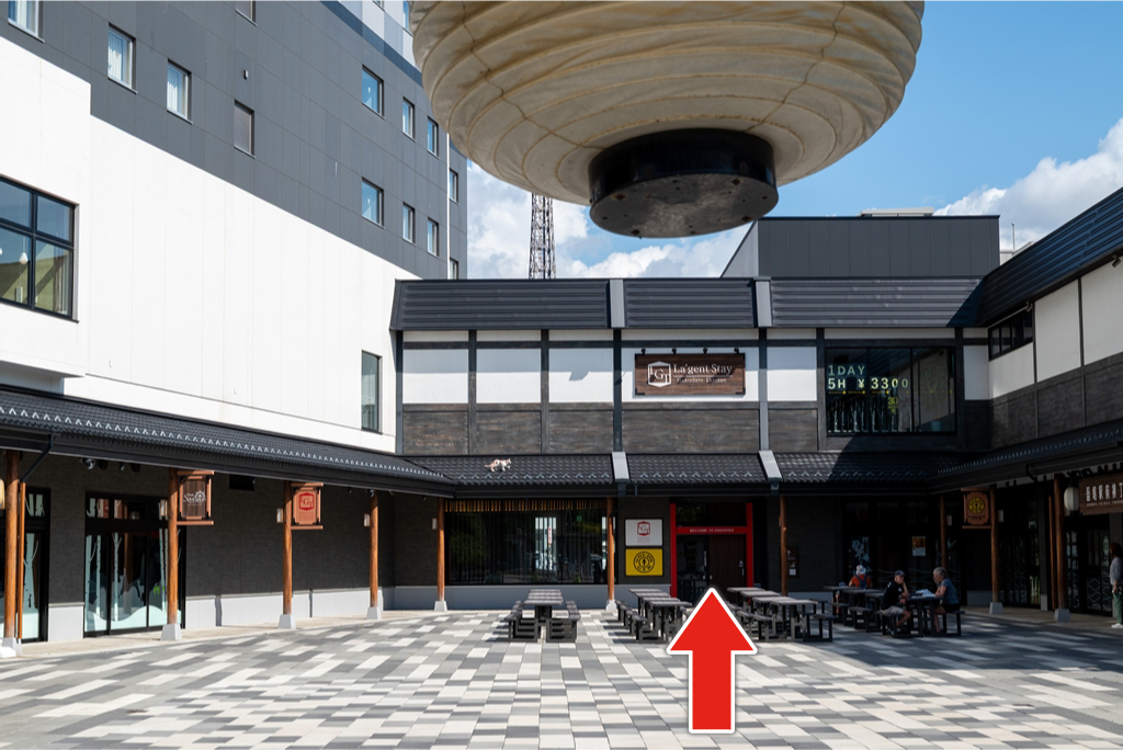 門をくぐったら、わき目も振らずまっすぐに進んだ先にある入口から施設に入ってください。入るとすぐ右手にあります。