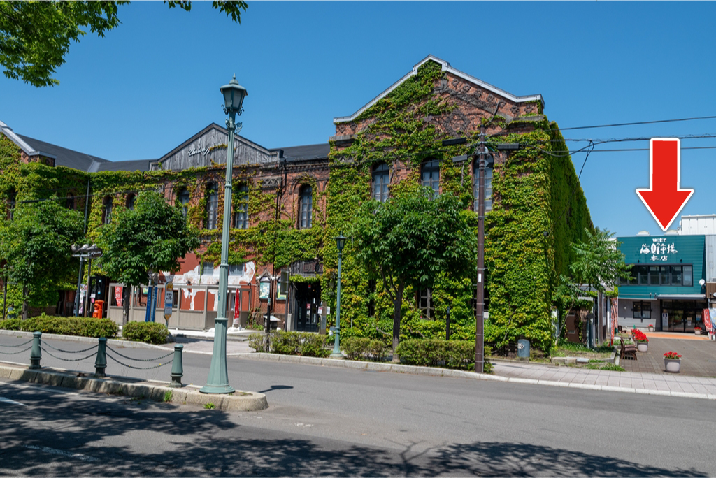 金森赤レンガ倉庫の中の「函館ビヤホール」がある棟です。食事を楽しんでいるお客さんの姿がガラス越しに見えるので分かりやすいと思います。