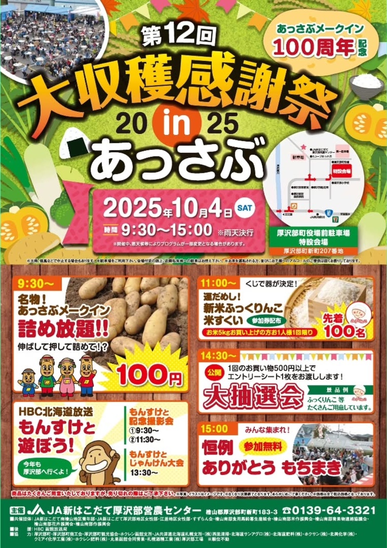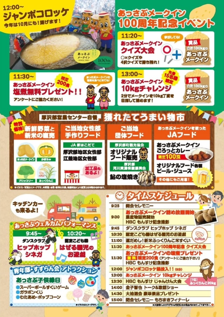 あっさぶメークイン詰め放題や新米ふっくりんこの米すくい、新鮮野菜と新米の販売、手作りフード販売、ジャンボコロッケ揚げなど、食にちなんだプログラムが盛りだくさん。