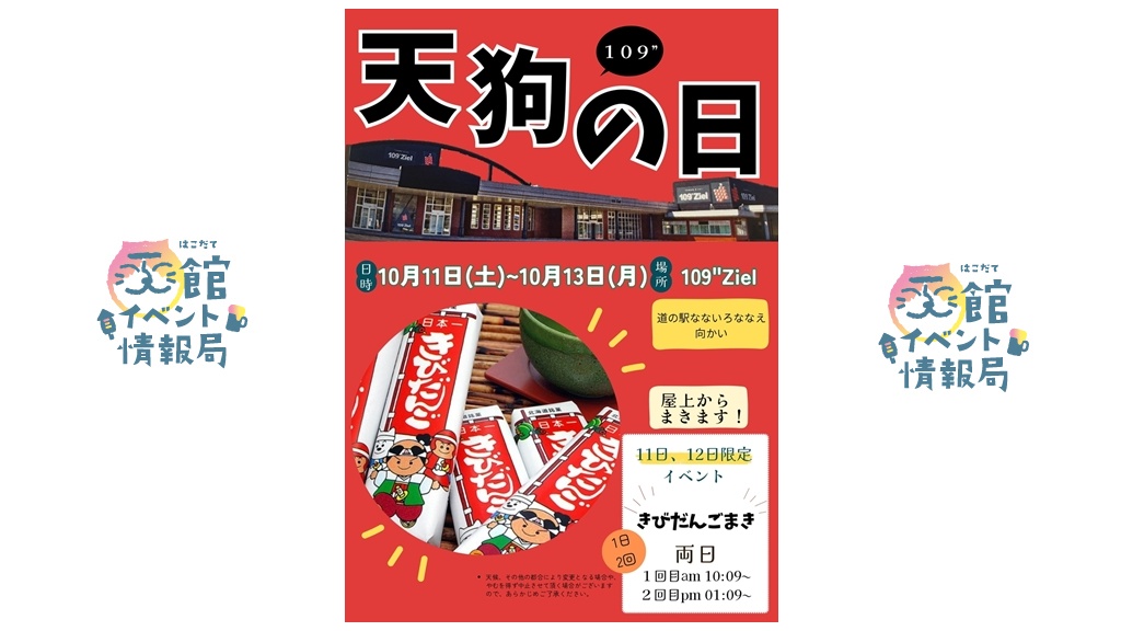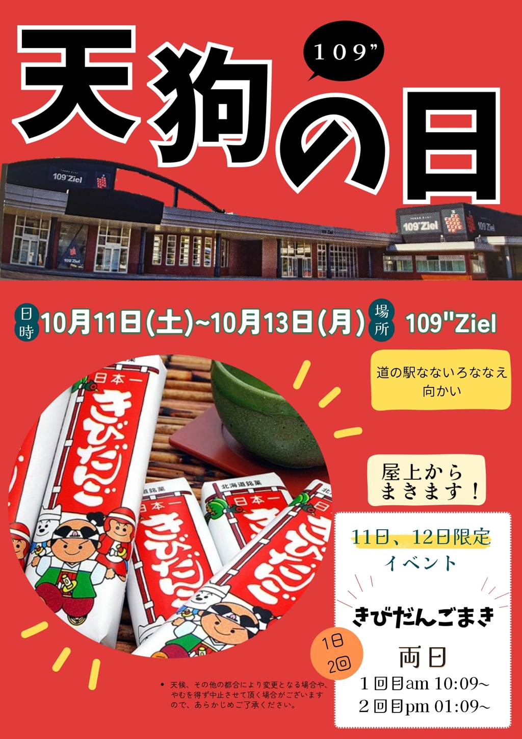 11日(土)と12日(日)の2日間のみ、屋外できびだんごまきを実施する。開催時間は1回目 10:09から、2回目13:09から。