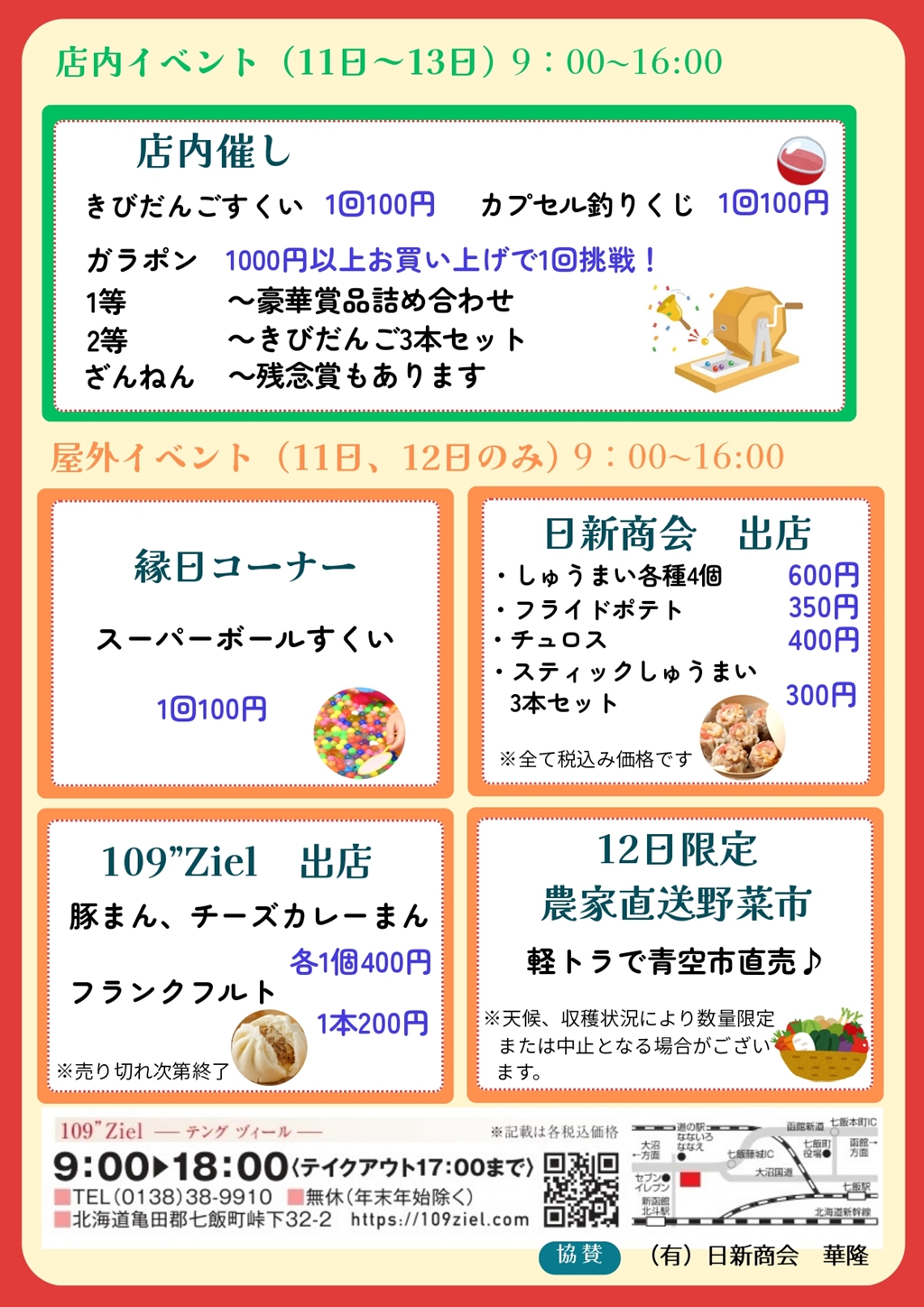 店内で「きびだんごすくい」「カプセル釣りくじ」(どちらも1回100円)を実施するほか、買い物1,000円以上で1回挑戦できるガラポン抽選会を開催。