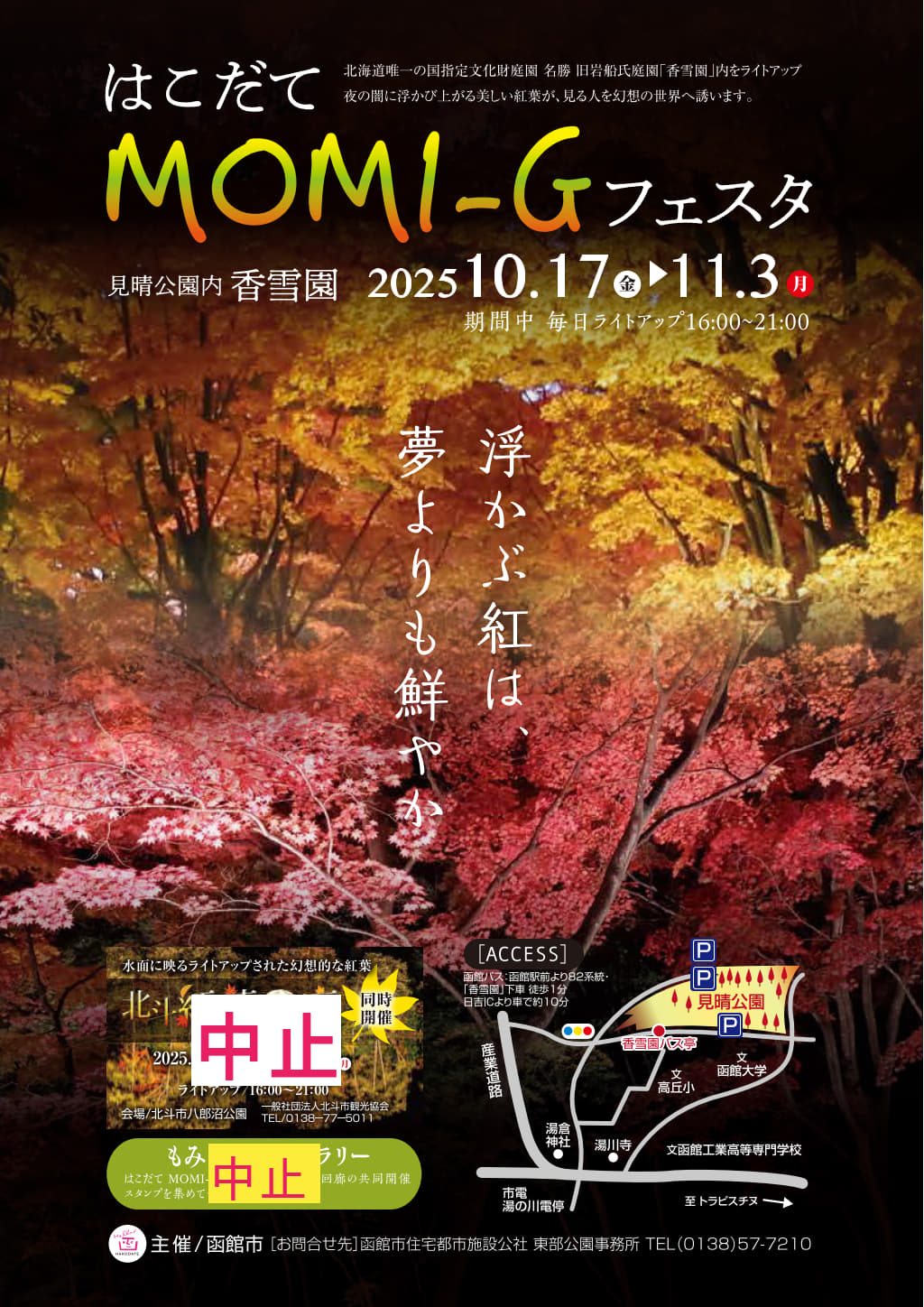 北海道唯一の国指定文化財庭園「香雪園」の紅葉シーズンに合わせ、カエデ並木を中心に夜間のライトアップを行う。
