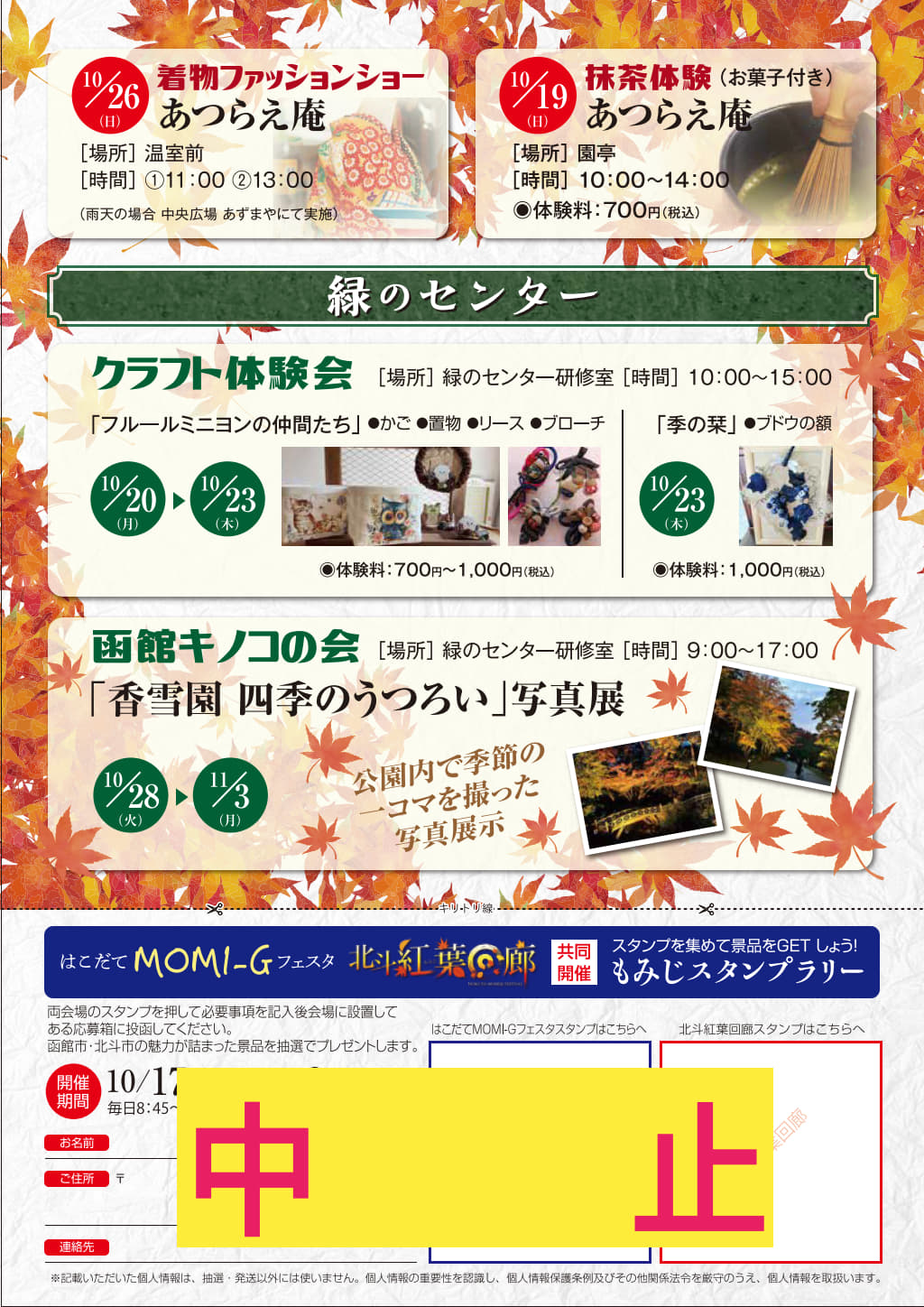 北斗市「北斗紅葉回廊」が中止となったため、2会場を巡る「もみじスタンプラリー」も中止となっています