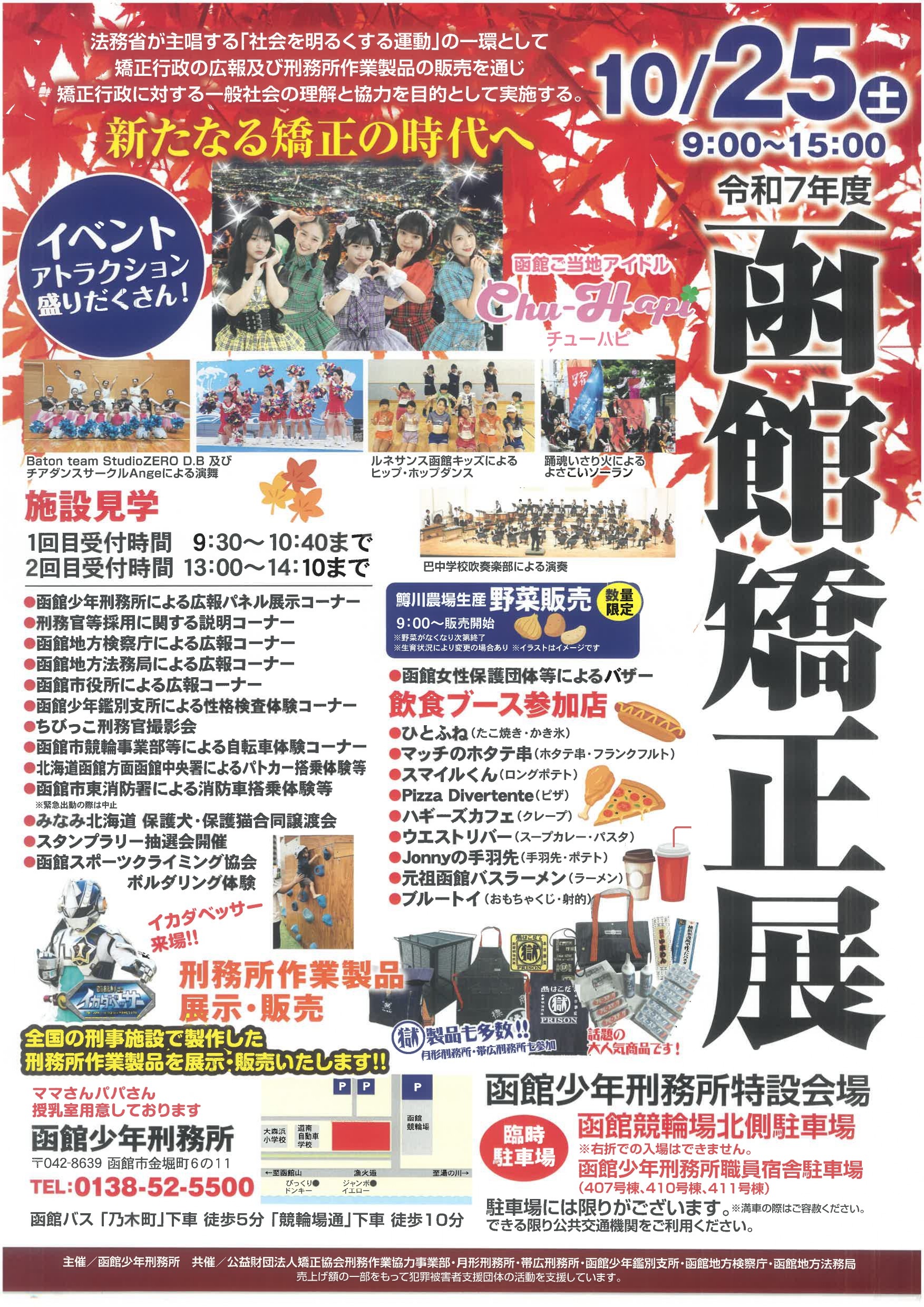 函館と全国の刑務所作業製品を販売するほか、各種広報・展示コーナー、飲食販売、野菜販売、函館アイドル「チューハピ」などのステージ、パトカー・消防車の展示・搭乗体験などさまざまな催しを用意。