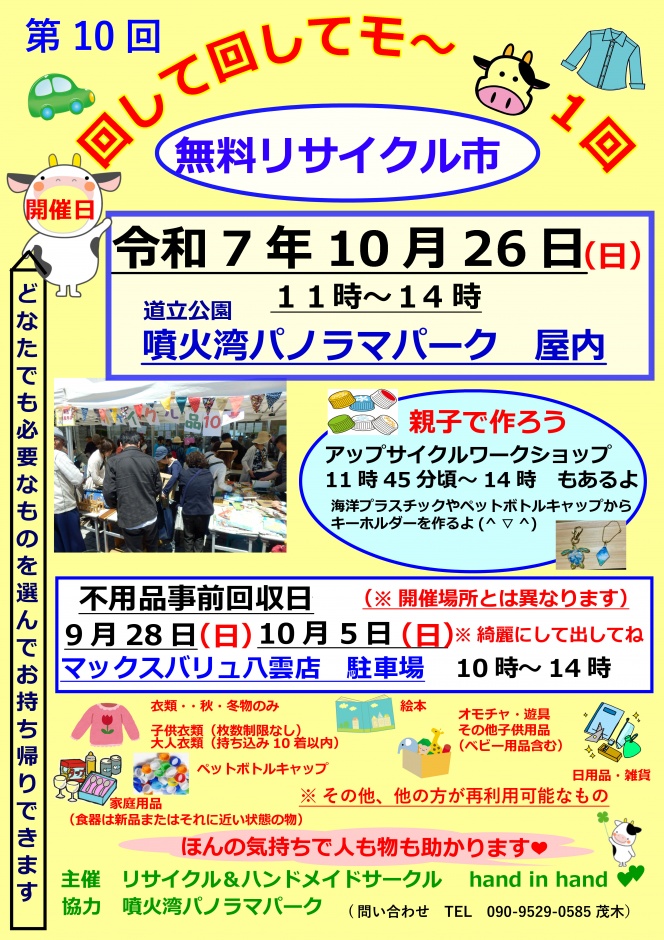 事前に回収した衣類・雑貨・おもちゃなど約3,000点が並び、当日は指定数まで無料で持ち帰り可能。親子で楽しめるアップサイクルワークショップも実施。
