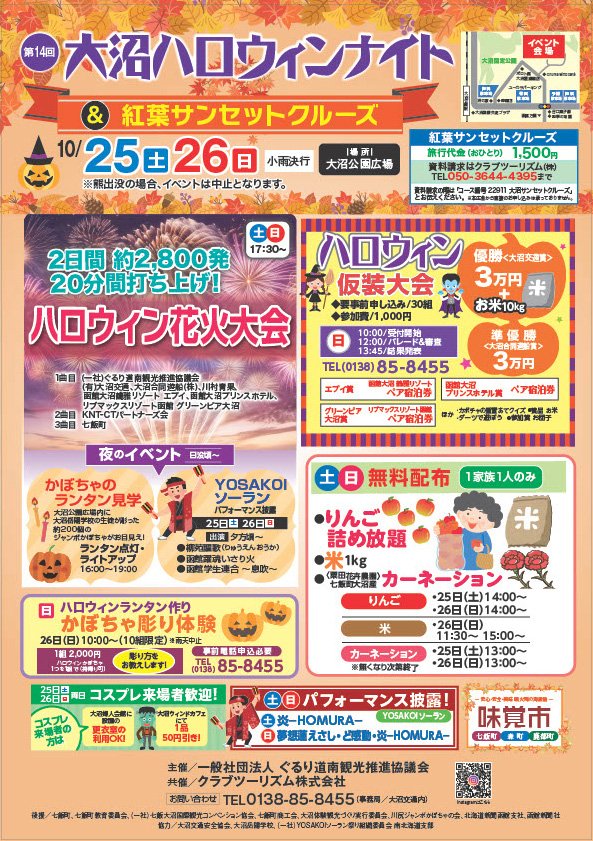 大沼公園広場に約200個のカボチャのランタンを設置し、16:00~19:00に点灯。両日とも夕方からYOSAKOIソーランの演舞、17:30より花火打ち上げを行う。