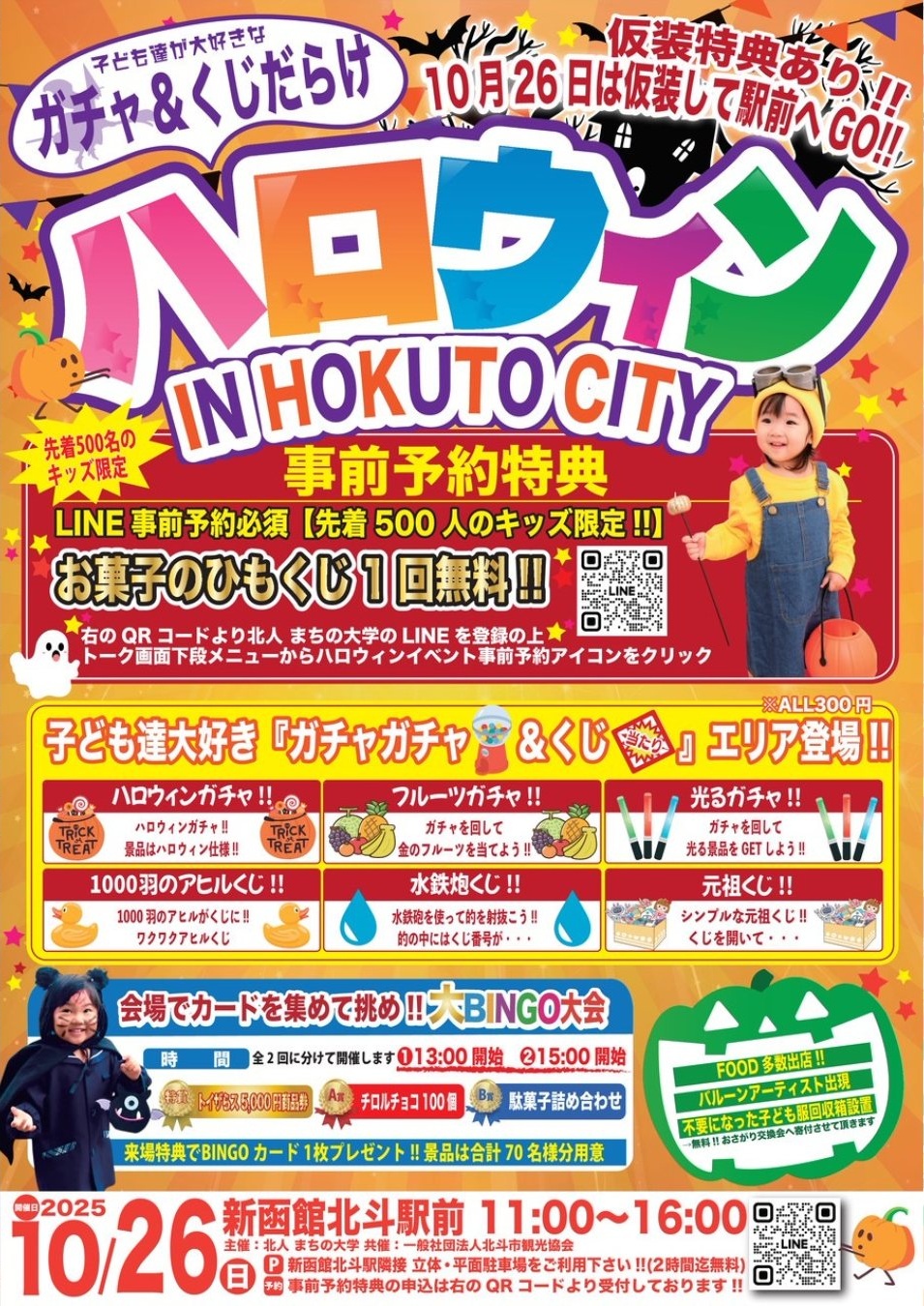 子ども向けのガチャとくじが盛りだくさんのハロウィンイベント。LINE事前予約(先着500人)で駄菓子のつかみ取りが1回無料になる特典あり。仮装して来場すれば、さらに楽しい特典があるかも。
