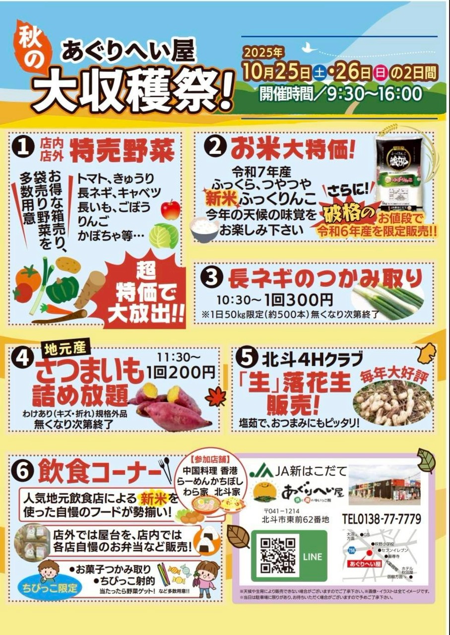 道南の秋の実りがお得に買えるイベント。採れたて野菜や新米の特価販売、長ネギつかみ取り、さつまいも詰め放題などのお楽しみ企画を用意。地元飲食店による新米を使ったフード販売や弁当販売もあり。