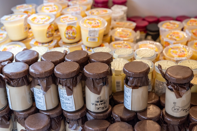 ずらっと並んだプリンの個性がすごい。瓶の形、色、ネーミング……まさにプリン百景。