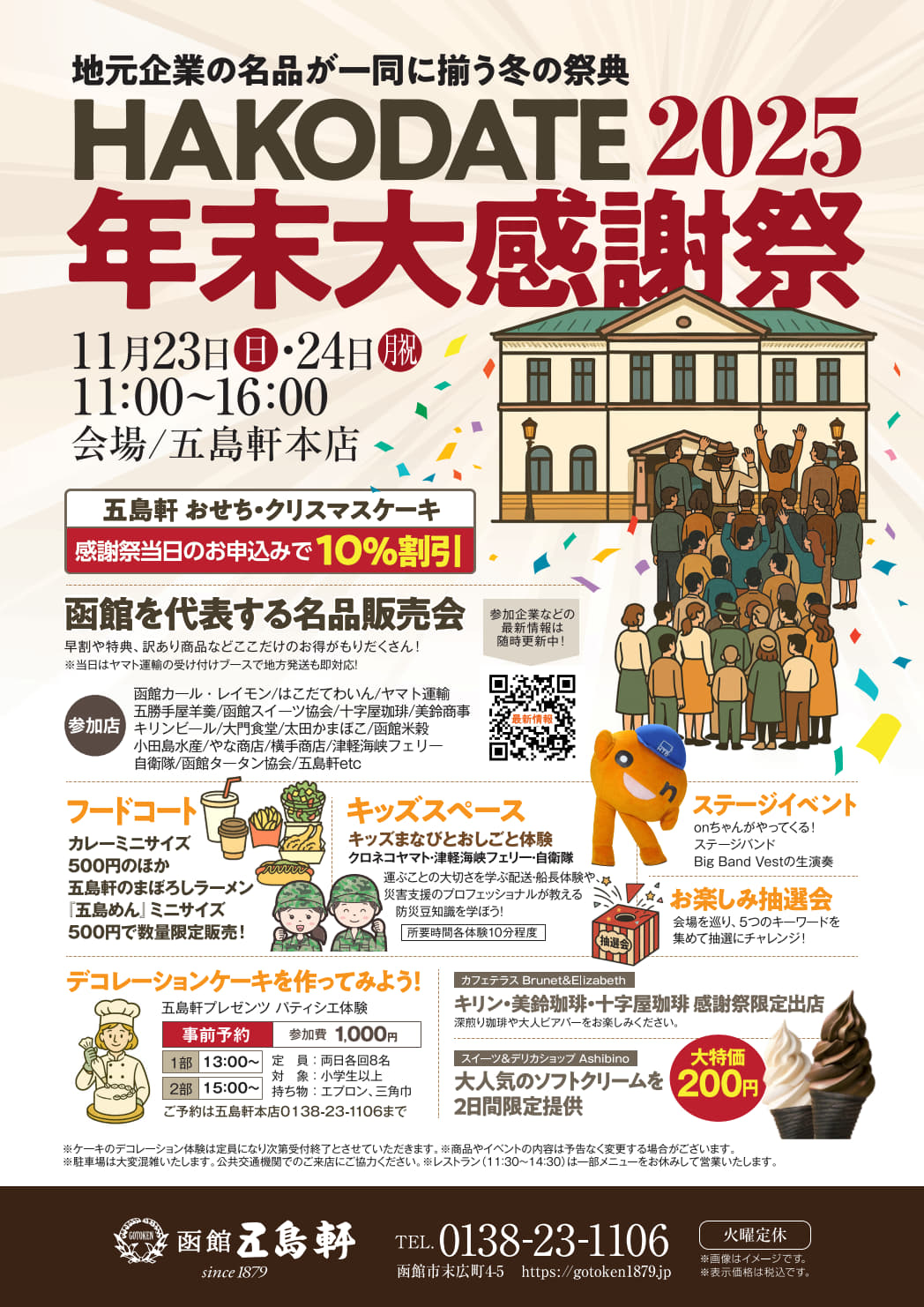 五島軒本店に地元企業や団体が集まり、「函館を代表する名品」を販売するほか、体験コーナー、飲食コーナー、ステージイベントなど、楽しい催しを繰り広げる。
