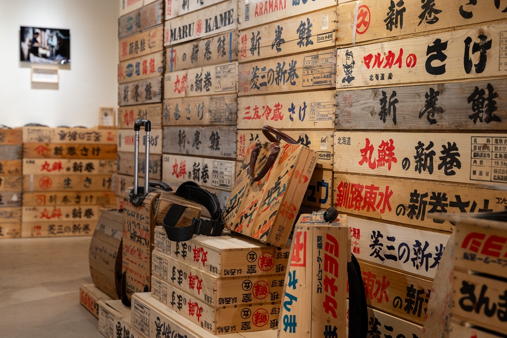 階段を上って会場に一歩入ると、そびえ立つ鮭箱の壁。そしてその下には、鮭箱で作ったカバンなどの作品がズラリと勢ぞろい。