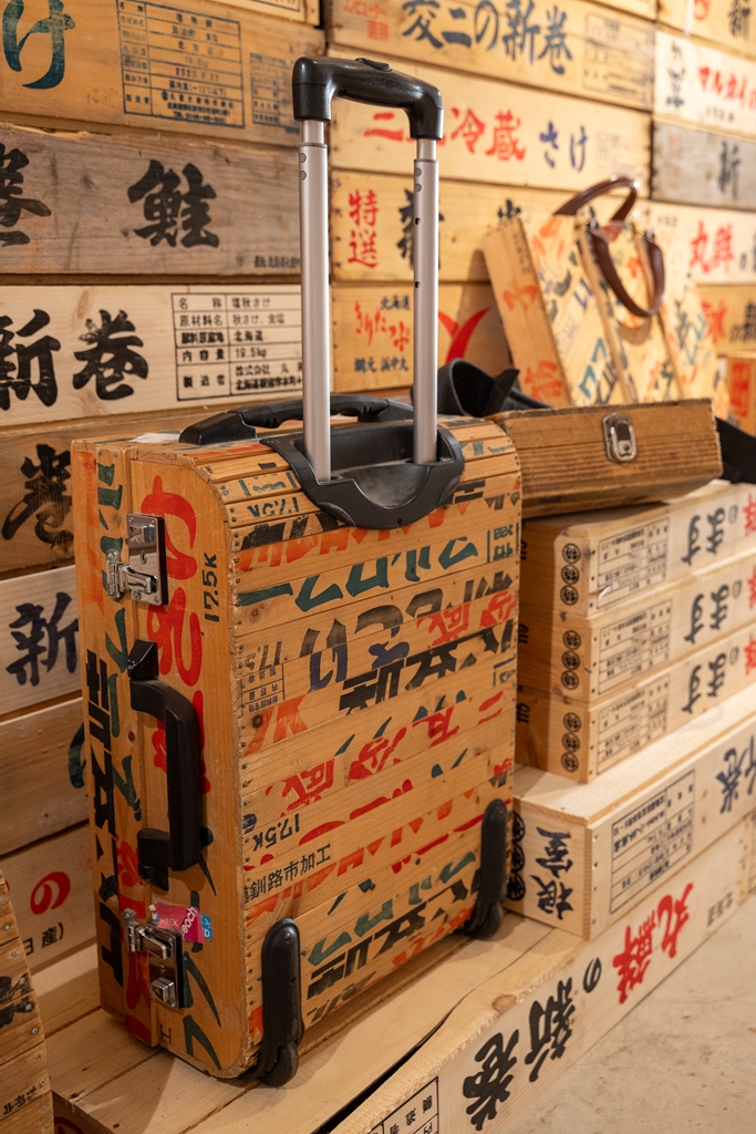 ▼こちらは鮭箱で作ったスーツケース。機内持ち込みサイズ。実際に使ったときの写真も見せていただきました。持ってみると思いのほか軽くてびっくり