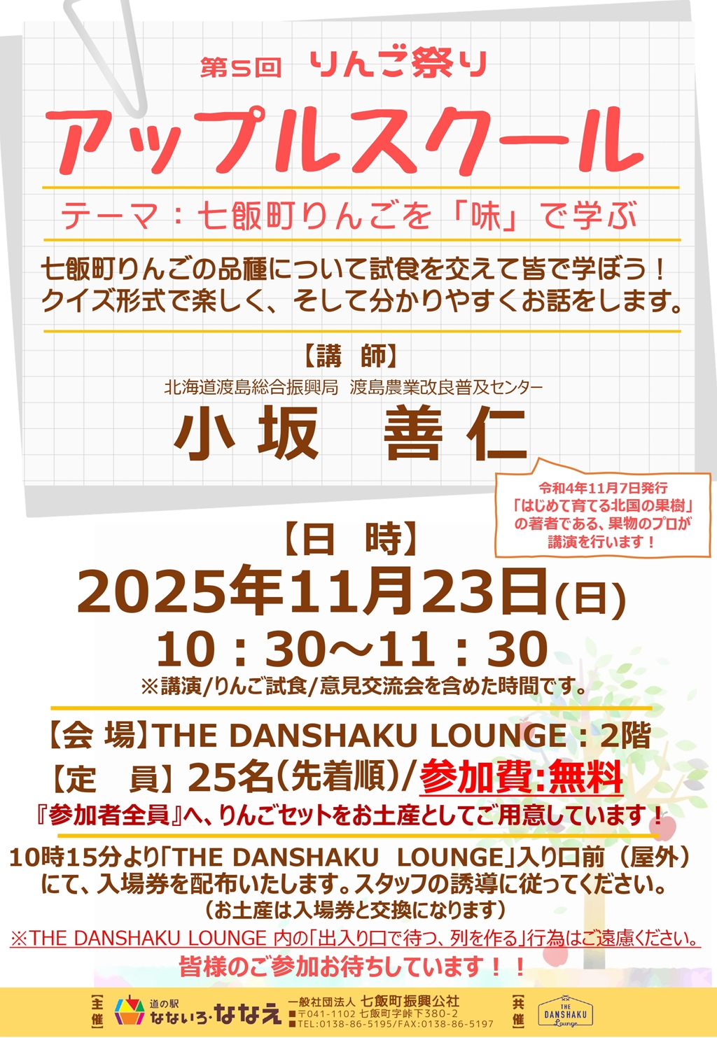 - アップルスクール(テーマ:七飯町りんごを「味」で学ぶ/THE DANSHAKU LOUNGEで開催)