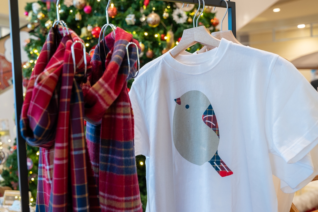 まず目に入ったのは暖色のマフラー。見た目でもう暖かそう。さらに、函館タータン入りシマエナガTシャツ。おしゃれ。