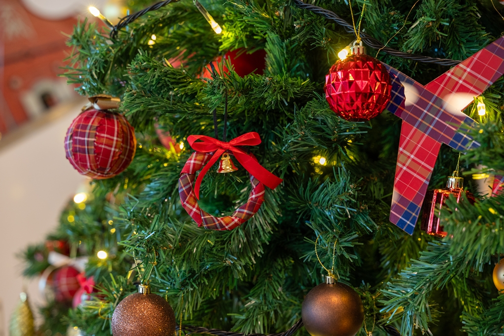 もう一度クリスマスツリーに近寄ってよく見ると、普通のオーナメントに混じって函館タータンのオーナメントが装飾されています。