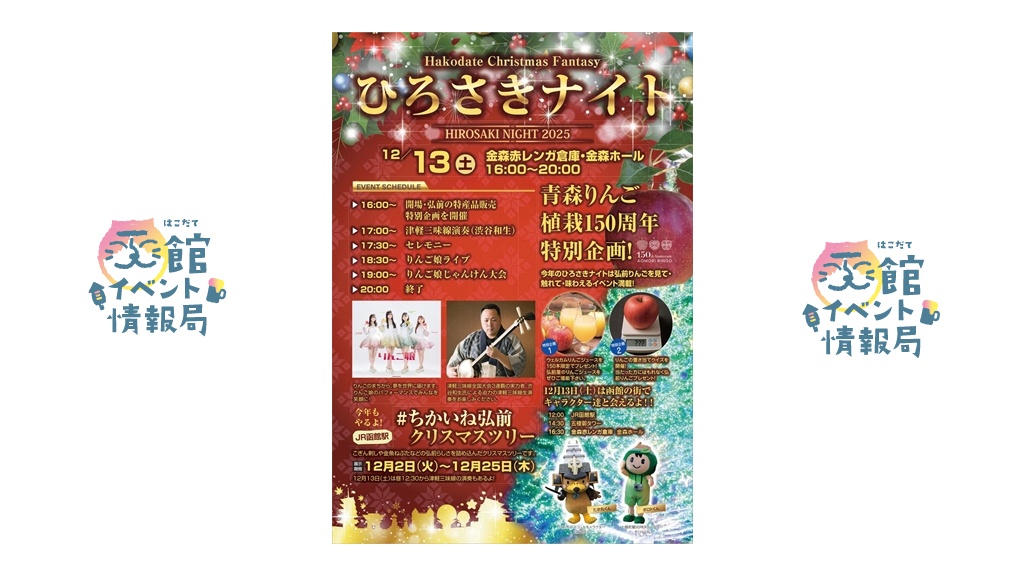 青森県弘前市が「はこだてクリスマスファンタジー」に合わせて実施する観光PRイベント。ステージイベントと物販などを行う。