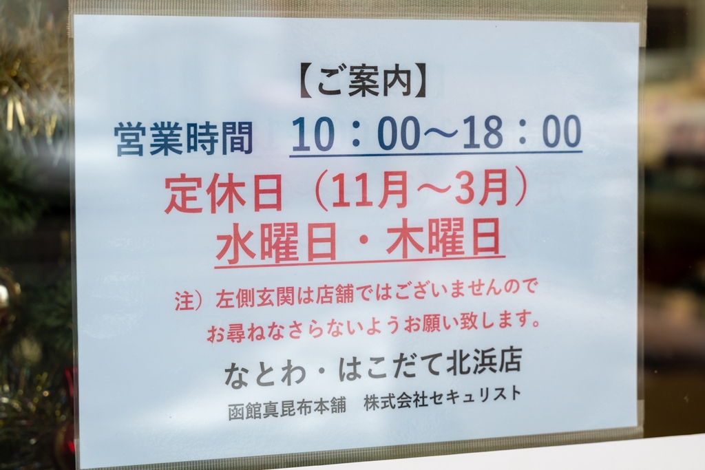 店名は「なとわ・はこだて北浜店」。営業時間は 10:00〜18:00。定休日は水曜・木曜(11月〜3月) です。