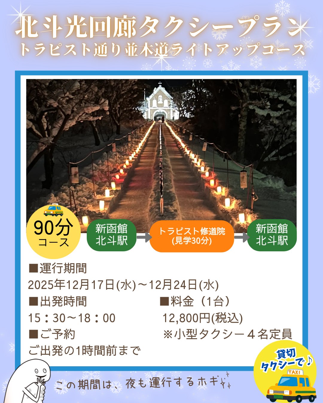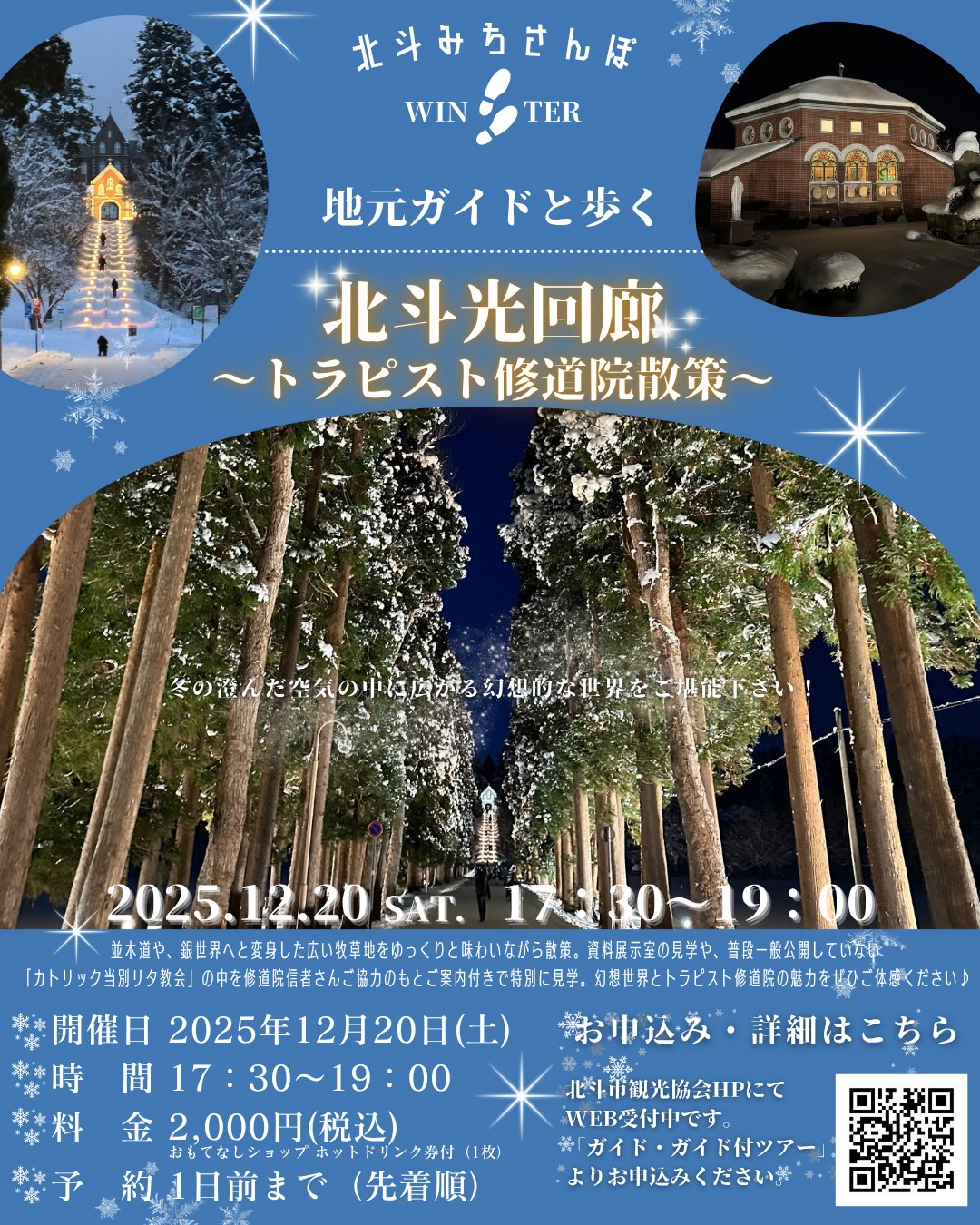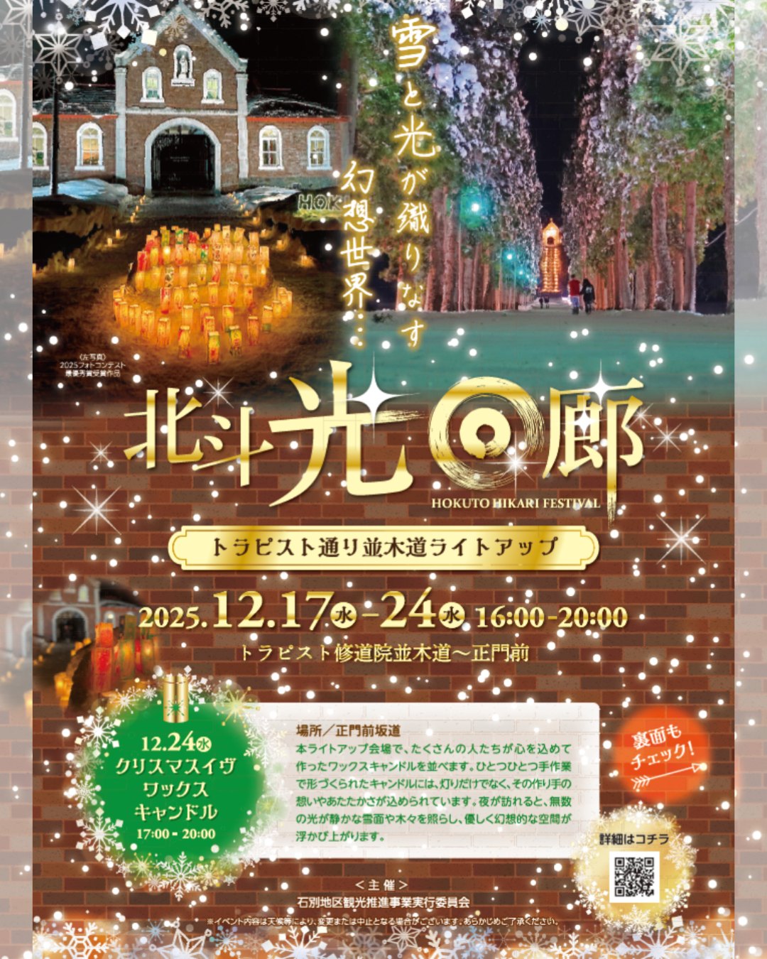 トラピスト修道院正門へと続く約400mの並木道をライトアップ。温かいスープなどを販売するおもてなしショップも開設する。