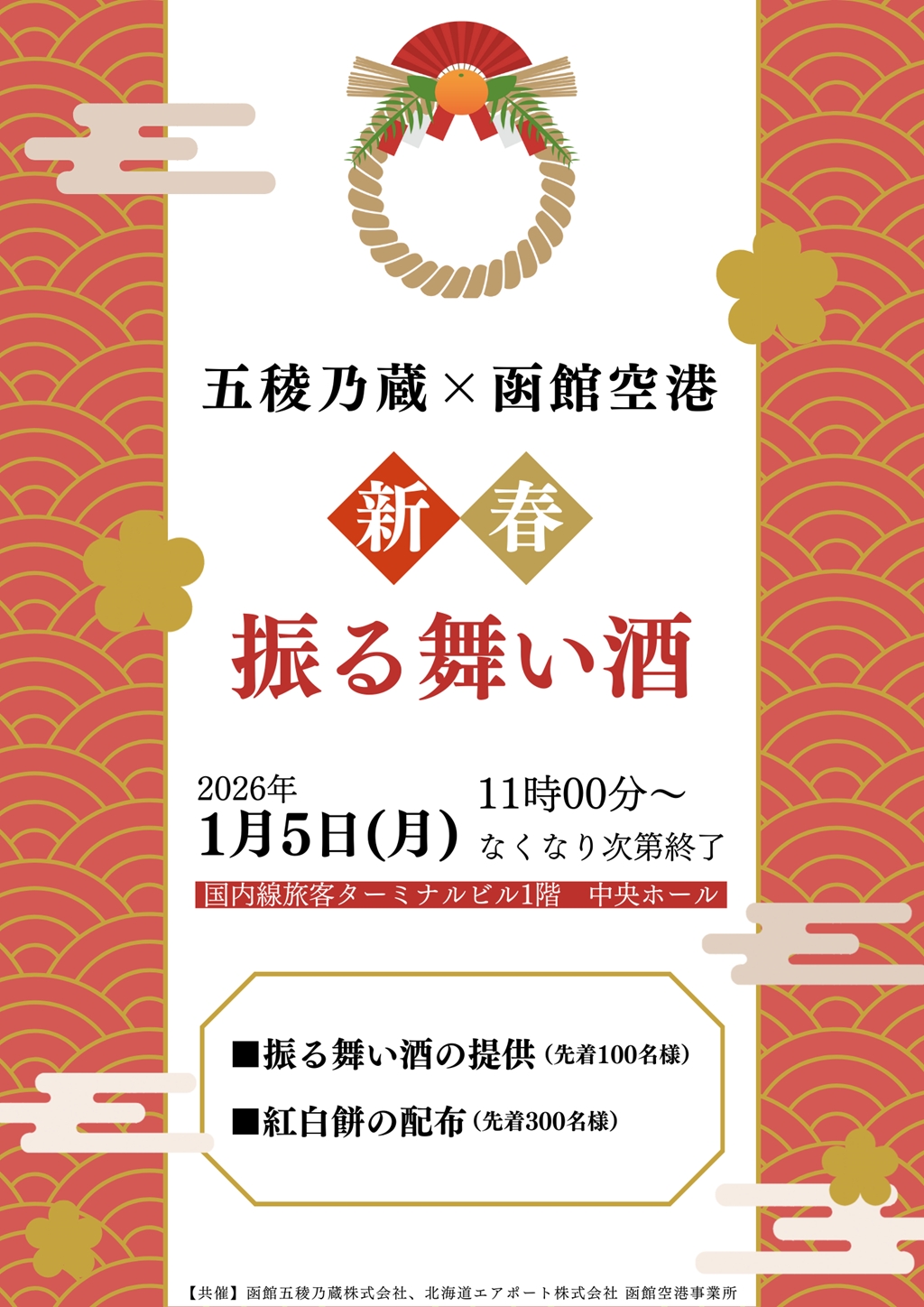 函館空港国内線ターミナル1階中央ホールにて、11:00から先着100人に函館の酒「五稜」振る舞い。同じく先着300人に紅白餅配布。
