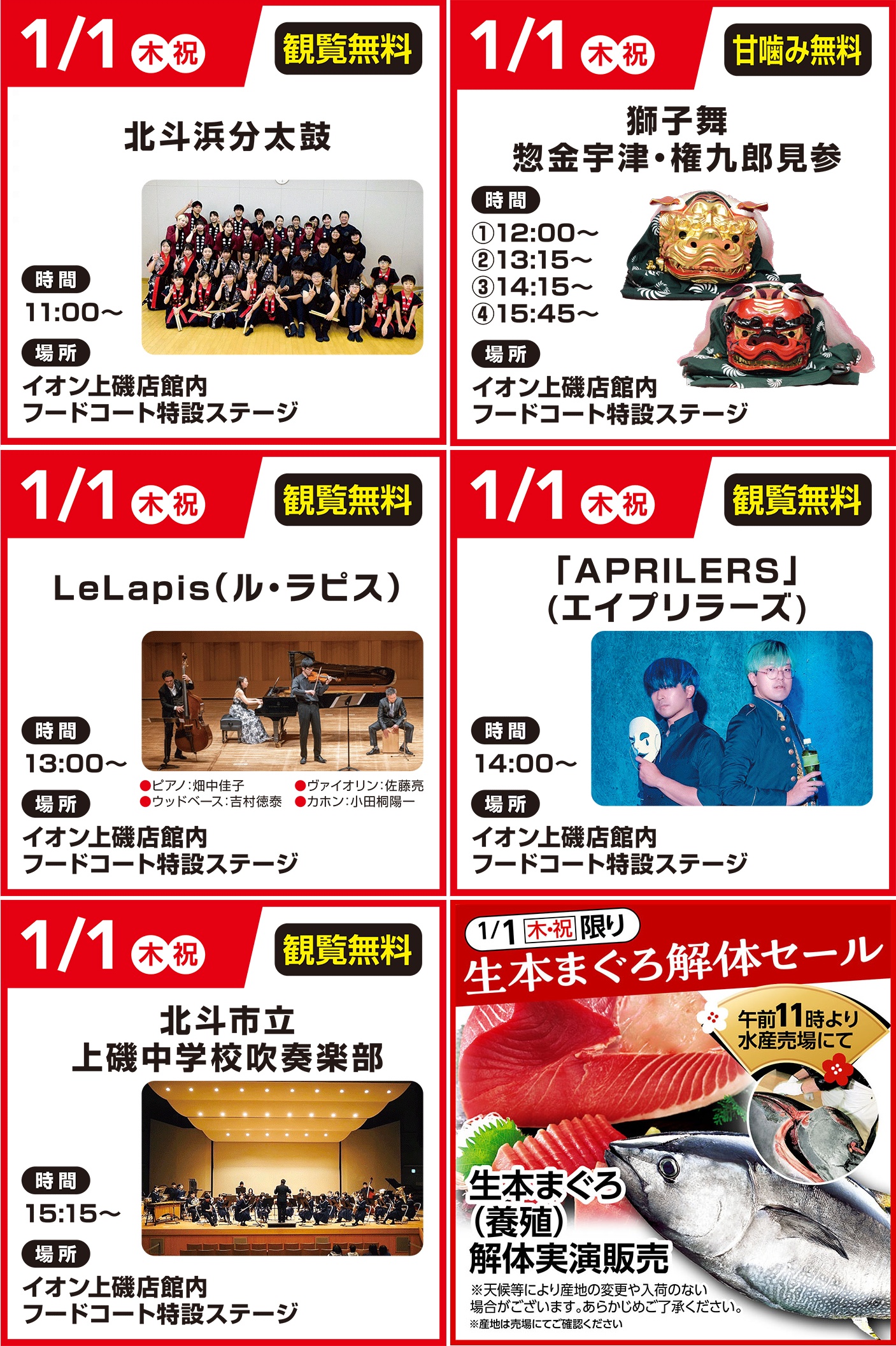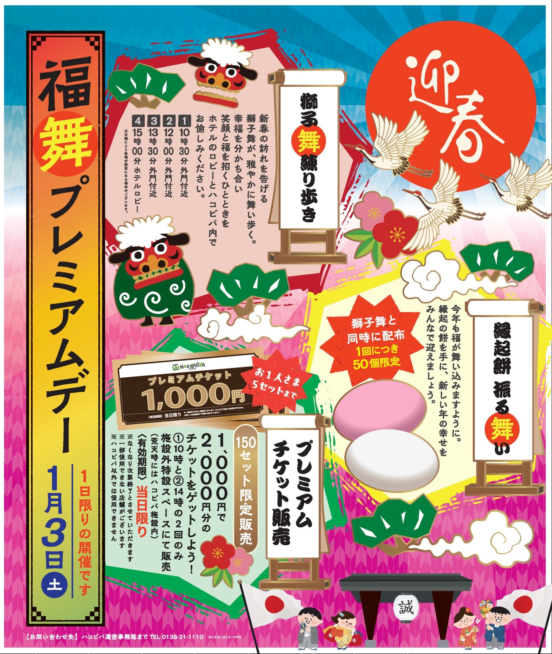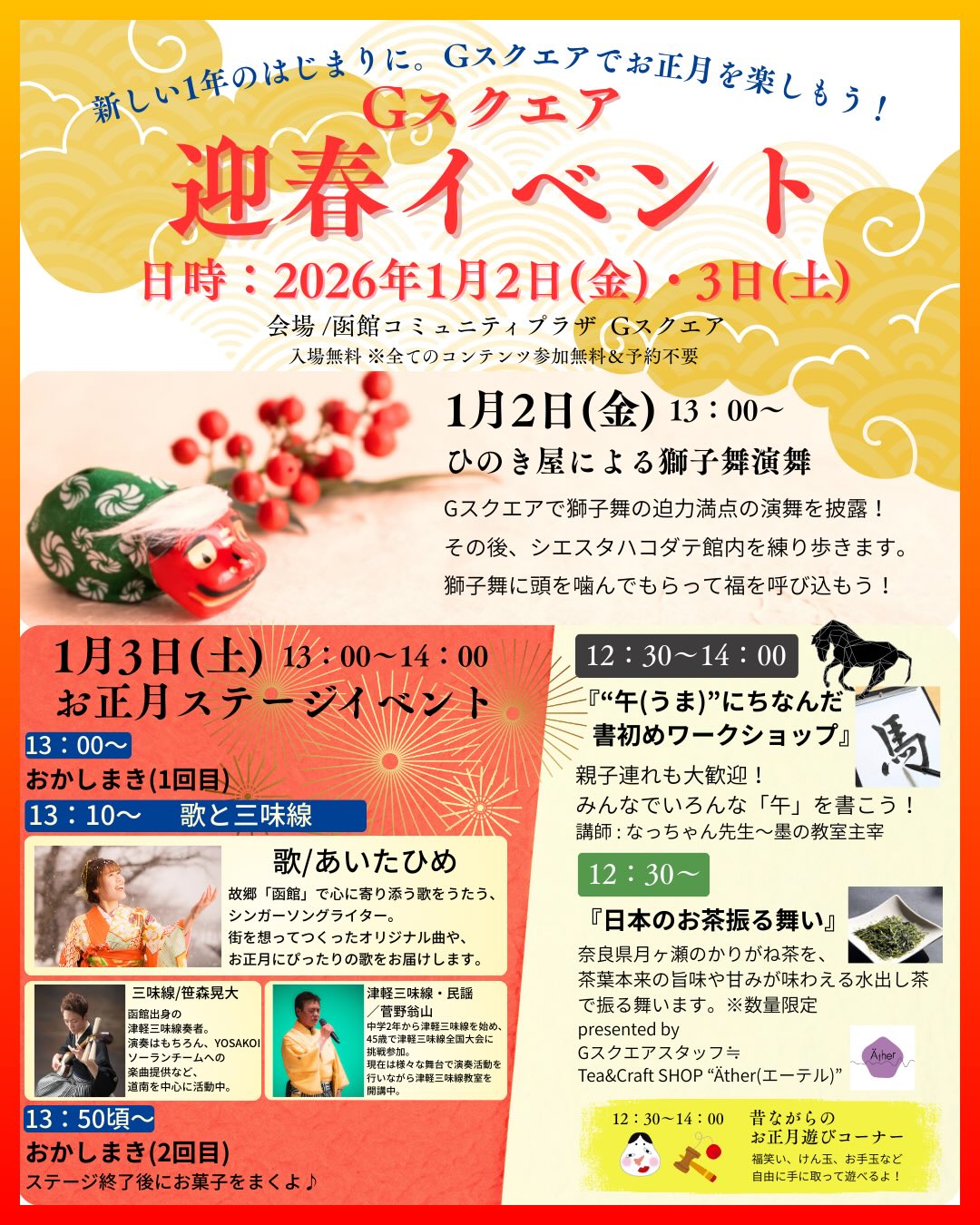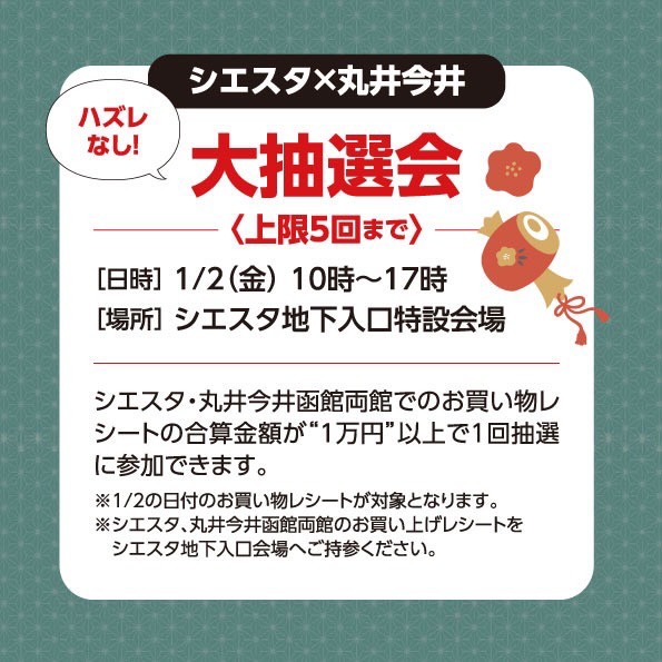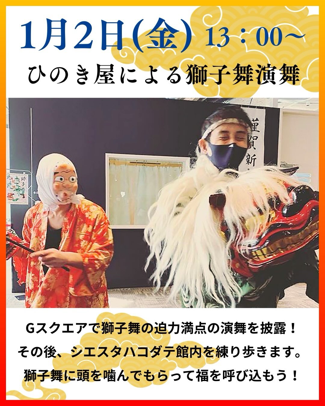 2日より初売り。2日のみ、丸井今井函館店と合同で抽選会を開催。同じく2日13:00より、4階Gスクエアで獅子舞の演舞を行い、その後館内を練り歩く。