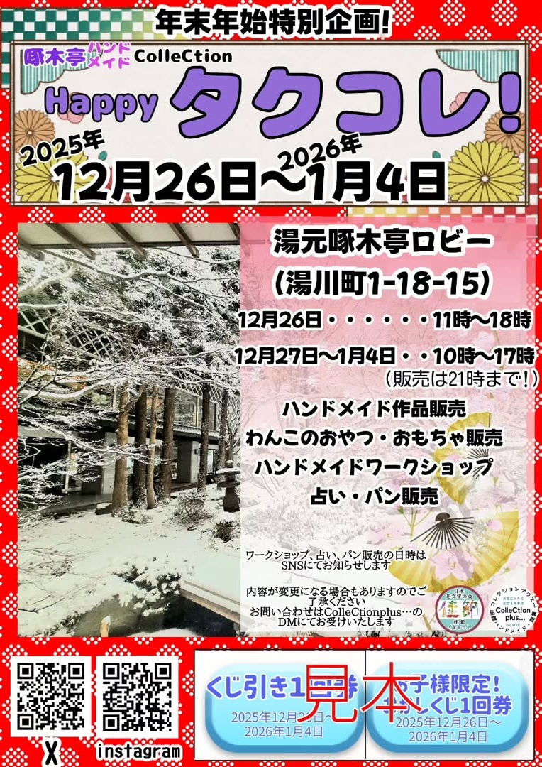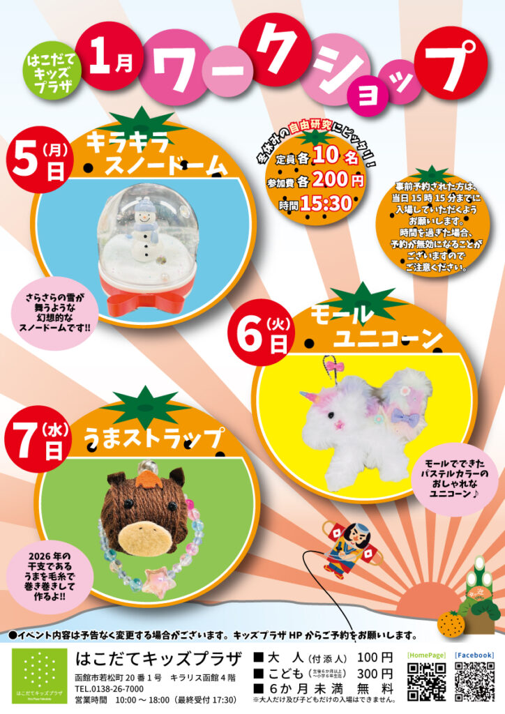 5日(月)から7日(水)は、事前申込制の「冬休みワークショップ2026」開催。各日定員10人。申込は下記リンクからお早めに。