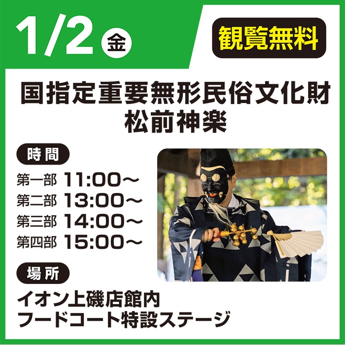 元日は演奏やパフォーマンスのステージあり。2日は松前神楽奏上。