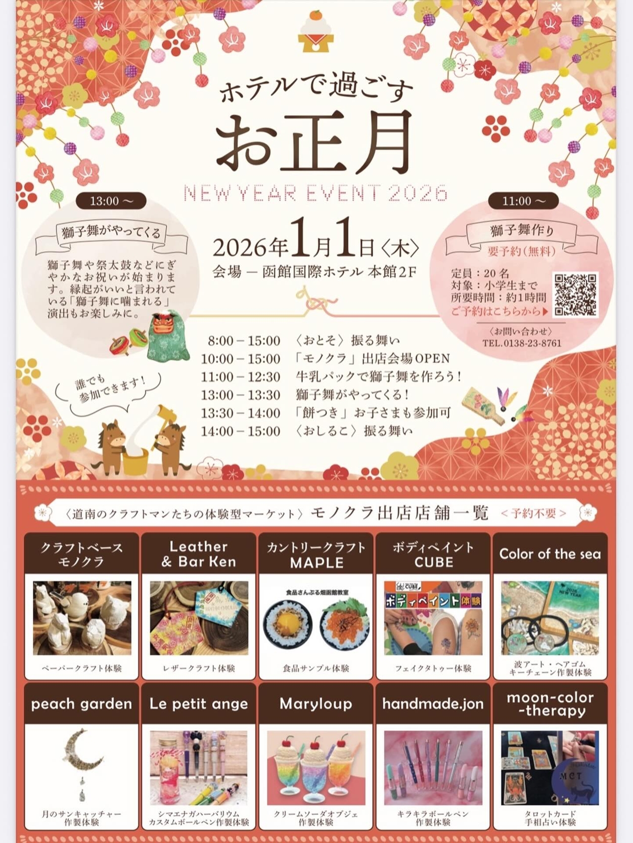 元日にイベントを開催。獅子舞演舞、餅つき&おしるこ振る舞いを行うほか、函館モノクラによるものづくり体験(有料)を実施。