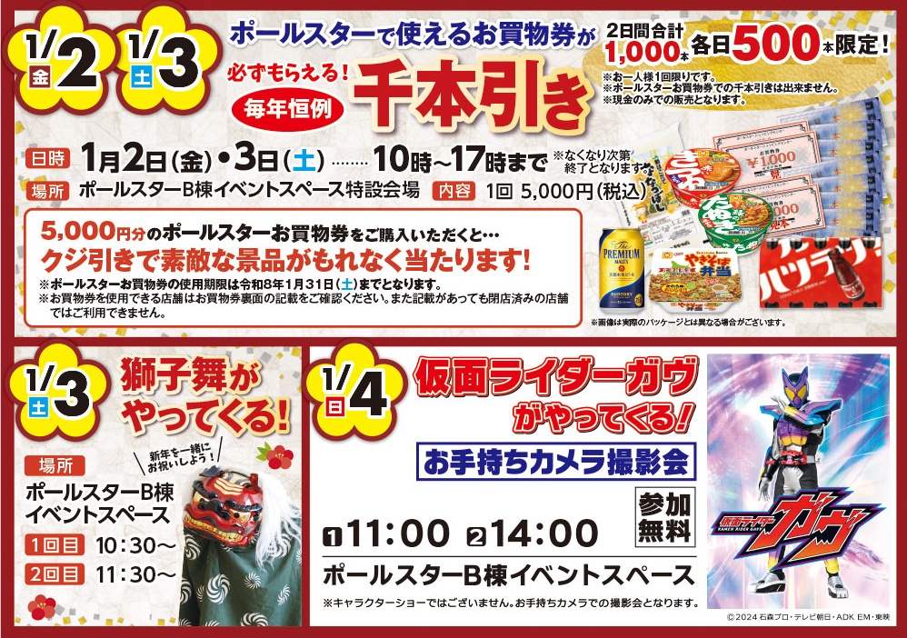 2日と3日、5,000円分のポールスターお買物券購入で参加できる千本引きを実施(各日500本限定)。