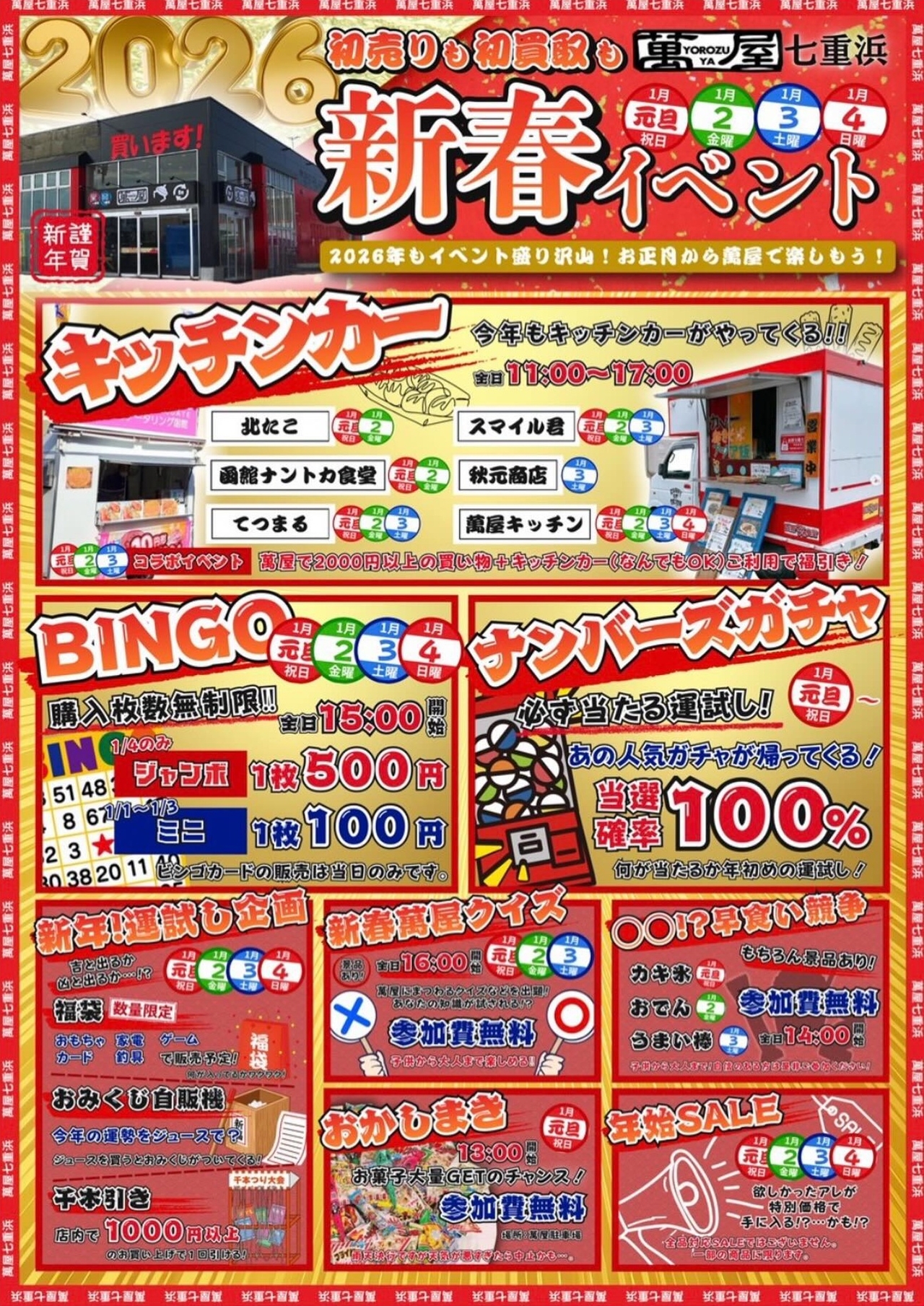 期間中、各日11:00からキッチンカーが出店するほか、毎日15;:00からビンゴ大会開催。ビンゴカードは当日販売。その他、元日から3日まで、各日14:00から「早食い競争」、各日16:00から「新春萬屋クイズ」など催しあり。