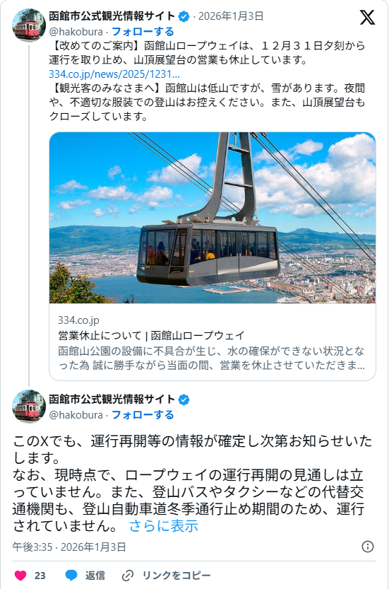また、繰り返しになりますが、1月3日17時頃、給水設備の復旧作業完了により、函館山ロープウェイが1月4日15時から運行再開することが発表されました。
