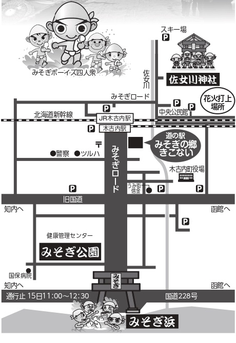 木古内町佐女川神社(木古内町木古内155-1)、みそぎ浜(木古内町木古内新道)、みそぎ公園(木古内町本町)