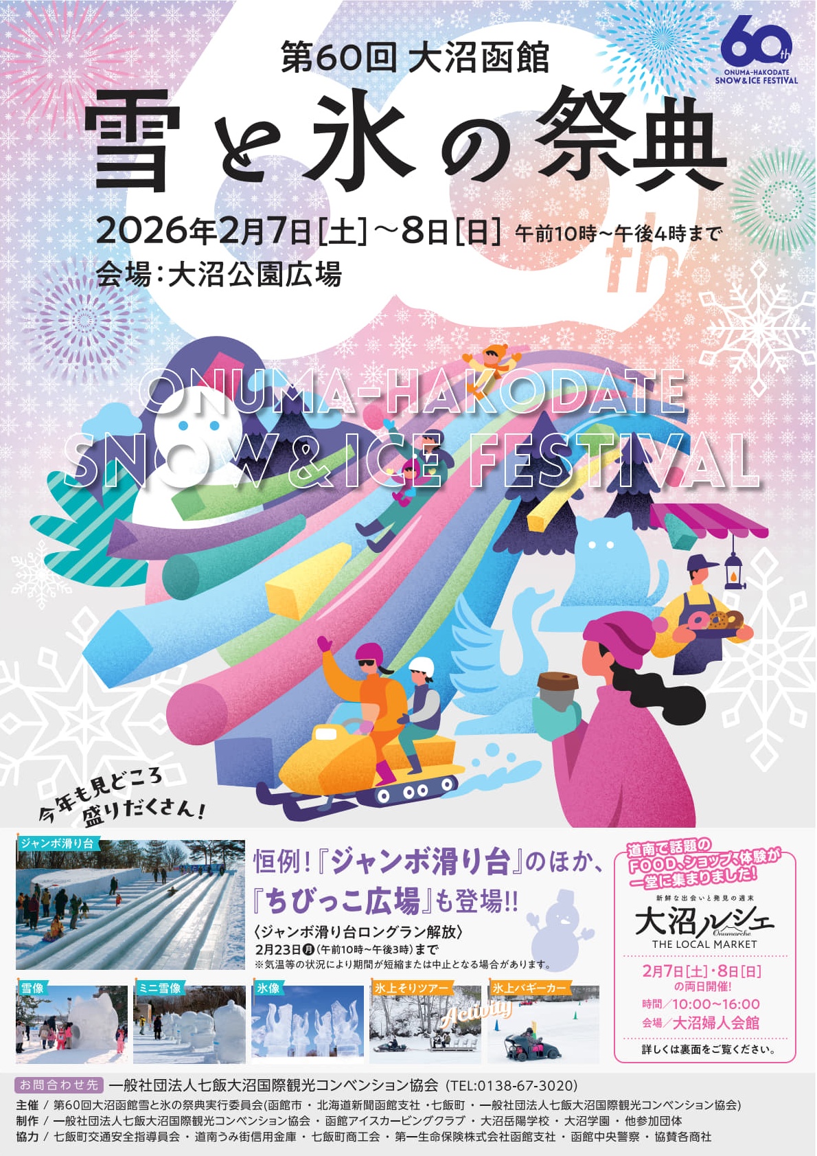 大沼の氷で作るジャンボすべり台をはじめ、大小の雪像・氷像展示などで冬を体感するイベント。今年は「ちびっこ広場」も開設。お祭り屋台も出店。