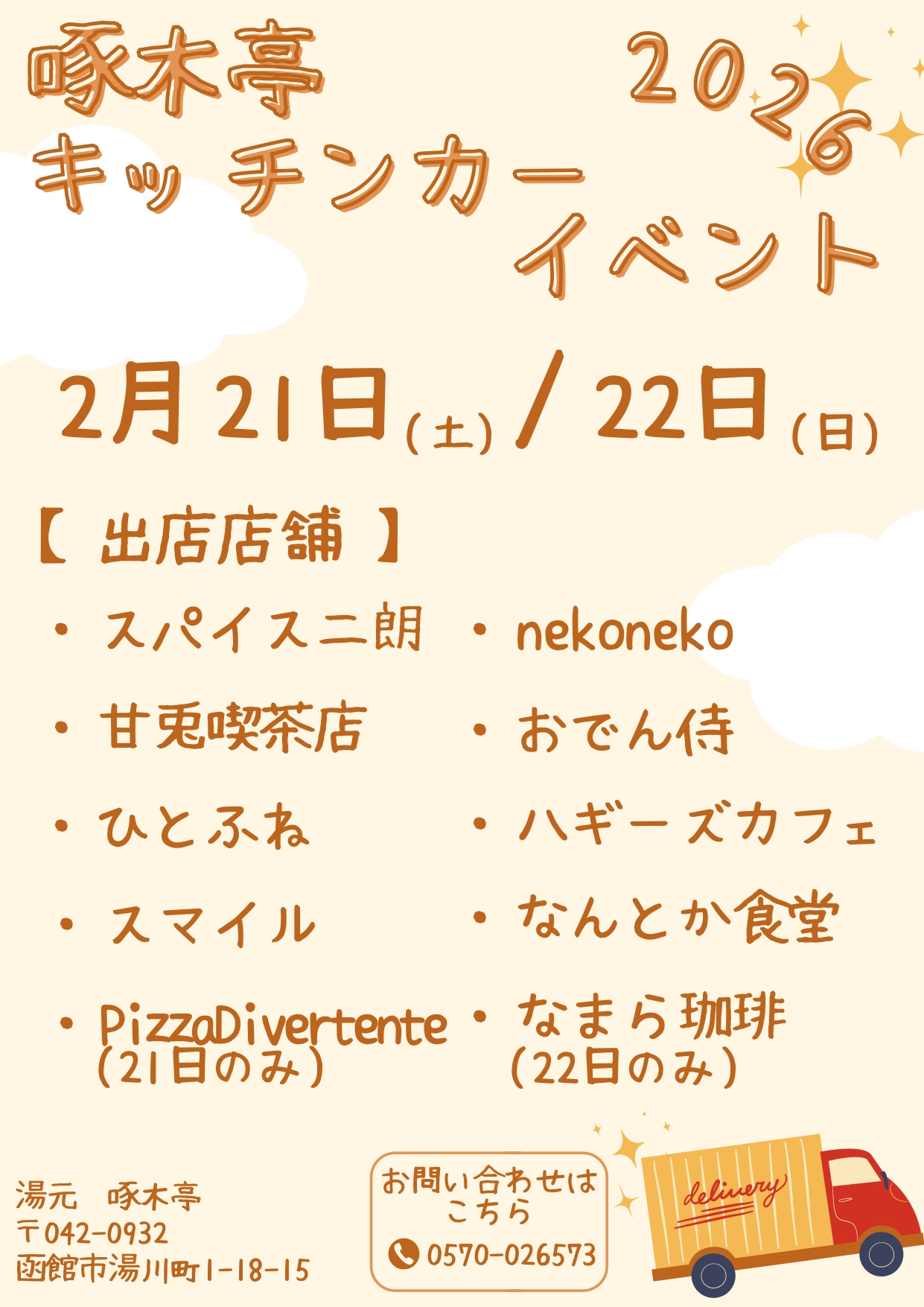 道南のキッチンカーが集まるイベント。詳細は啄木亭のSNSで発信。