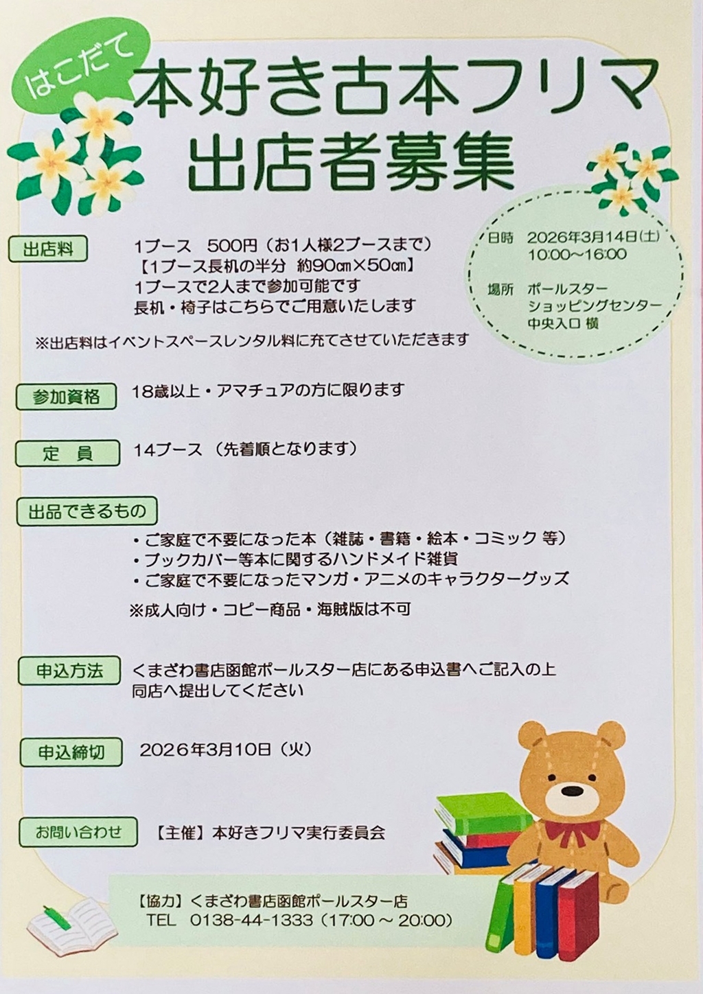 本が好きな一般の人が不要な本などを持ち寄り、販売するイベント。出店申し込み締め切りは3月10日(火)。