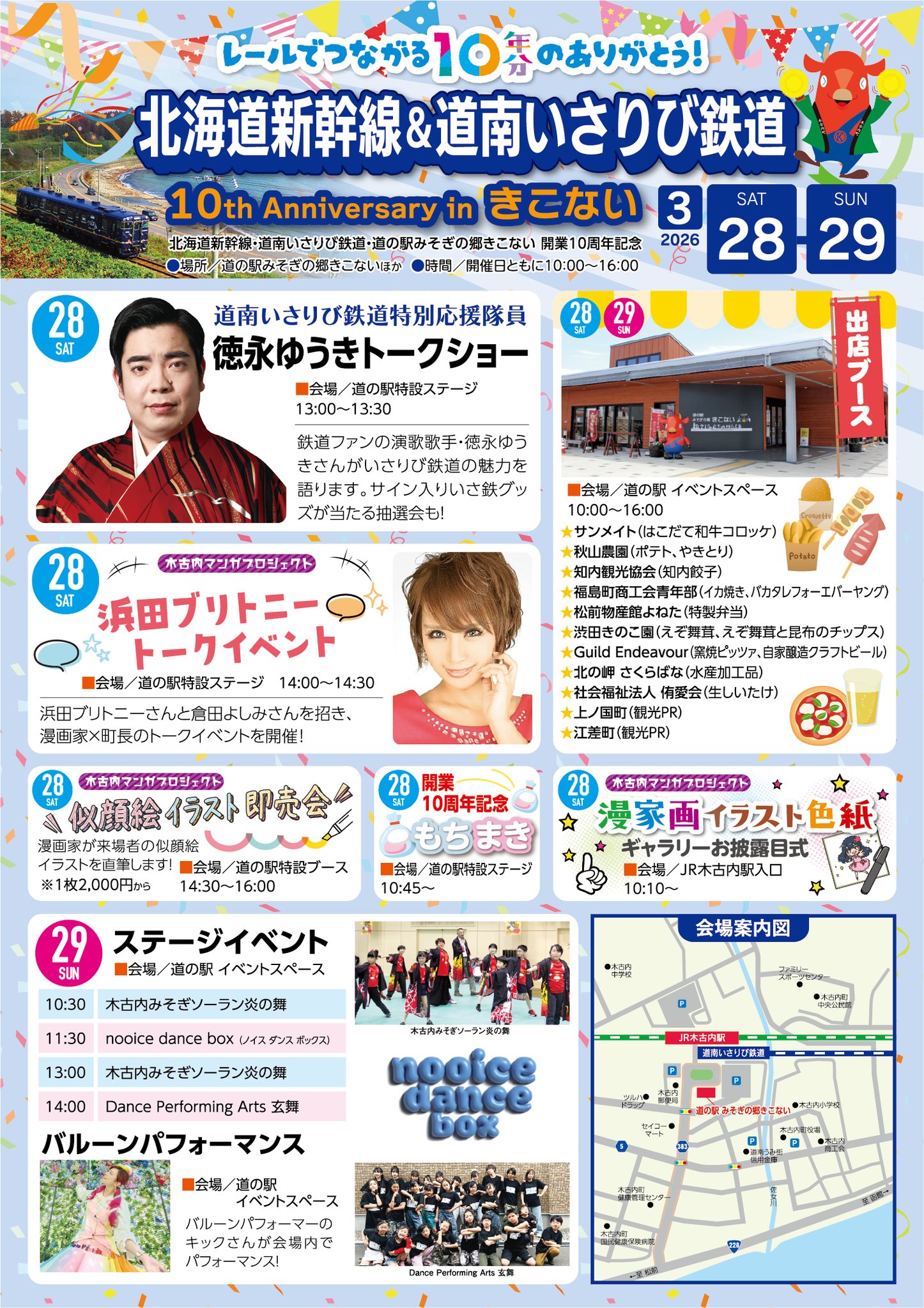 北海道新幹線と道南いさりび鉄道の開業10周年を記念するイベント。鉄道ファンとして知られる演歌歌手・徳永ゆうきさんや、漫画家・浜田ブリトニーさんのトークショー(28日)、地元グルメが集まるフードブース(両日)、ステージパフォーマンス(29日)などが実施される。