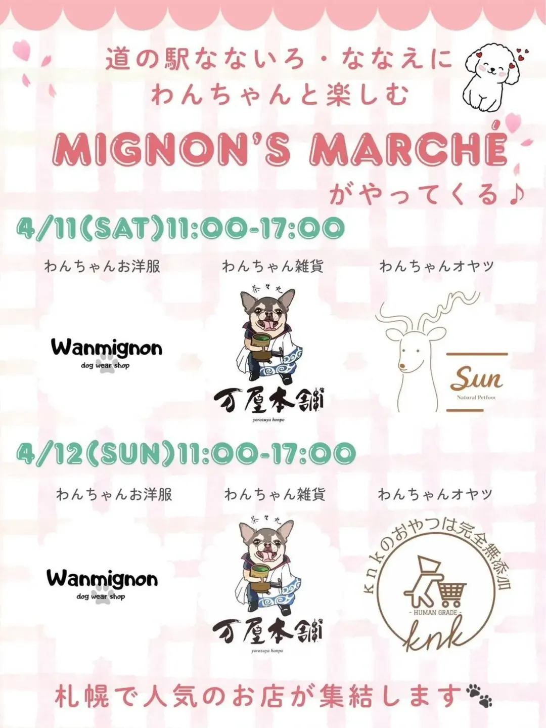国道をはさんで向かいの道の駅なないろ・ななえでは、犬用の服・雑貨・おやつなどの店が集まる「MIGNON’S MARCHE」同時開催(両日11:00~17:00)。