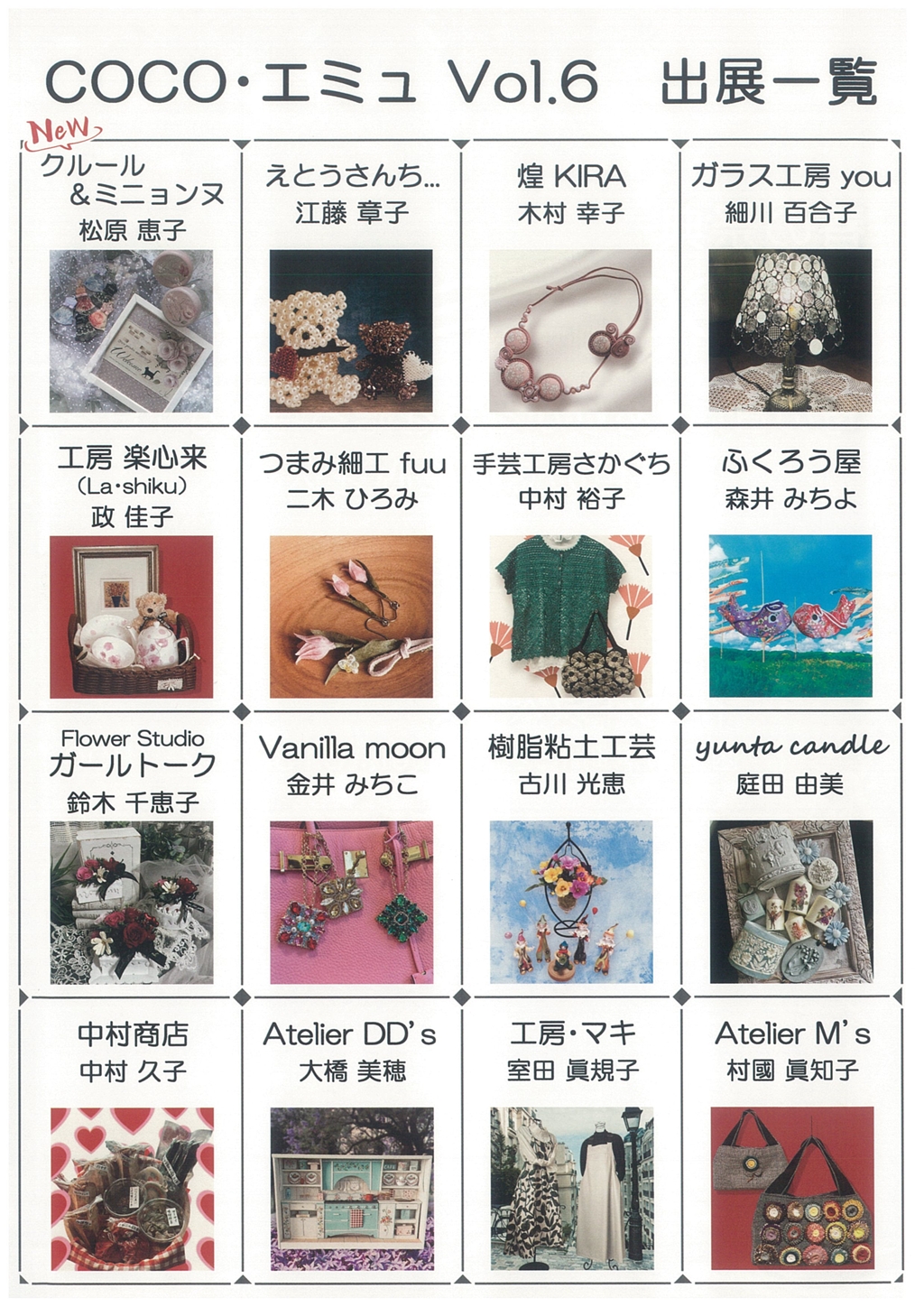 母の日に最適な作品をはじめ、手作りの工芸品・雑貨・布製品・アクセサリーなど16組のハンドメイド作家のブースが並ぶイベント。