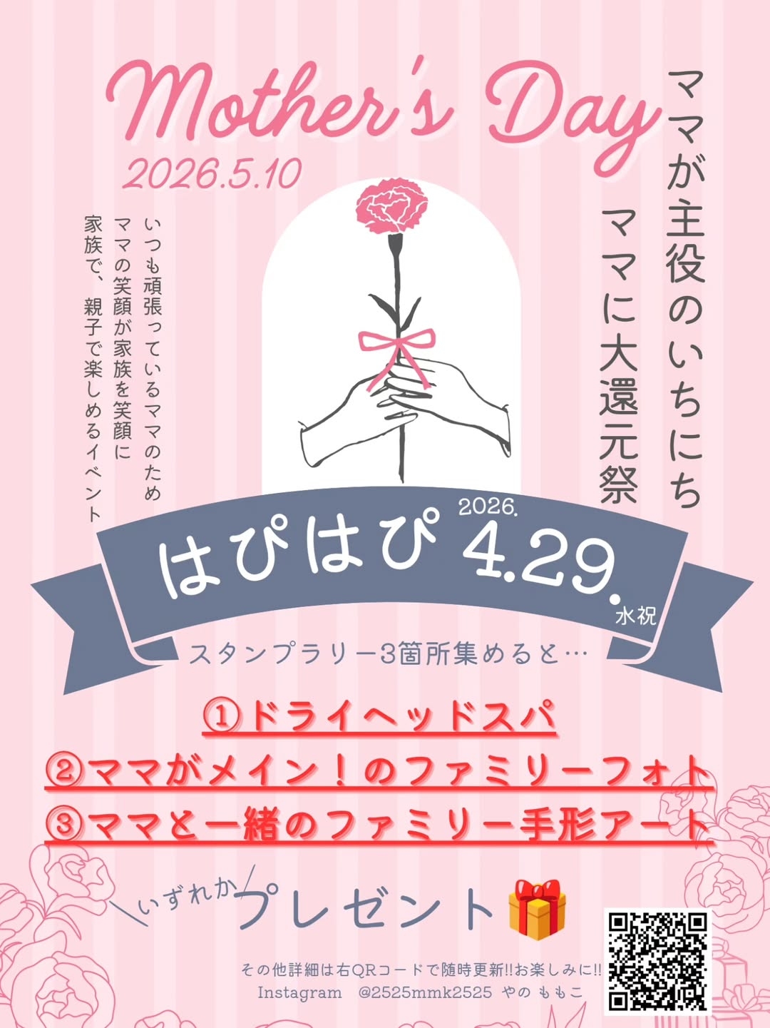 500円以上3店舗買い回りで、「ドライヘッドスパ」「ママがメイン!ファミリーPhoto」「ママも一緒の手形アート」いずれかプレゼント。