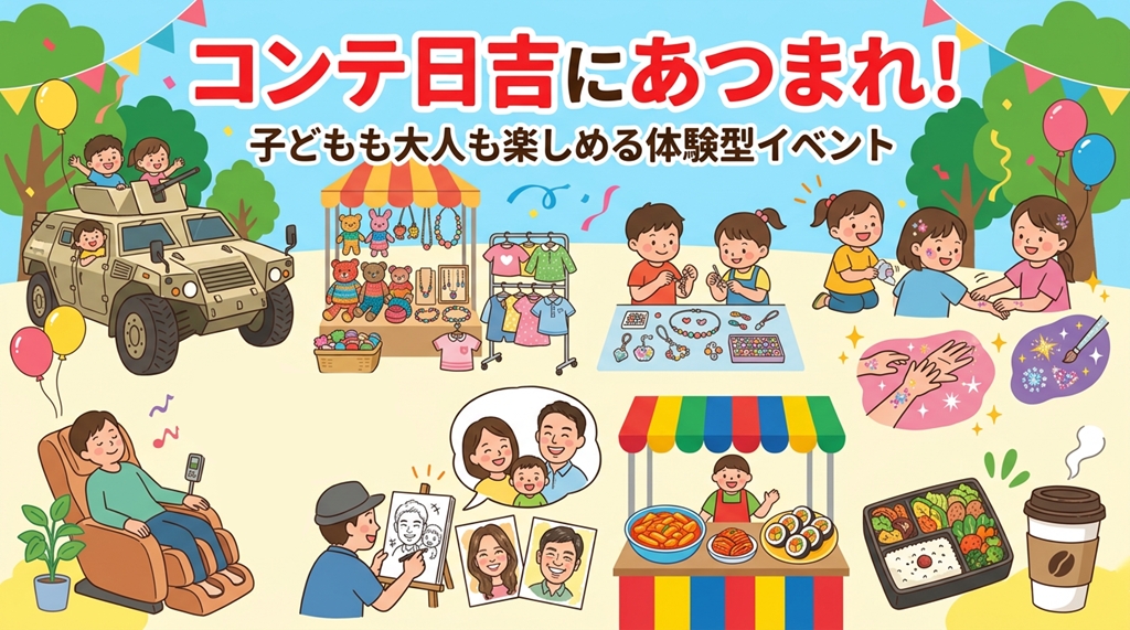 子どもから大人まで楽しめる体験型イベント。自衛隊車両の体験や記念撮影、フリマ・ハンドメイド販売、各種ワークショップ、癒し体験、グルメコーナーなど多彩な企画が集結。