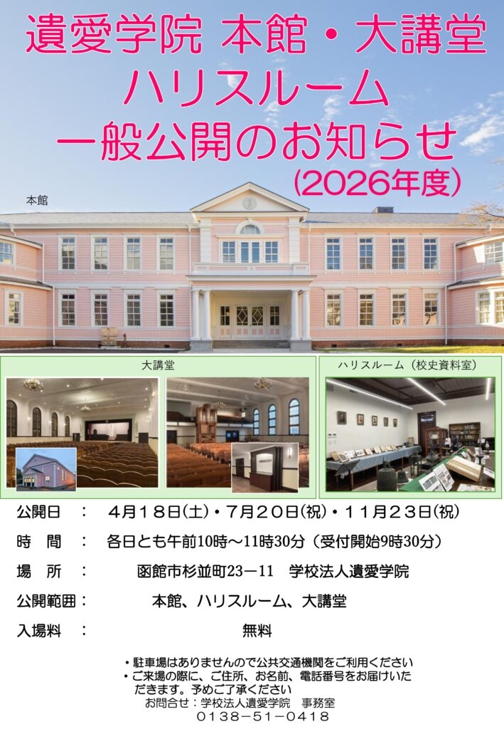 国指定重要文化財であり、2018年から保存改修工事を実施してきた遺愛学院本館と大講堂、さらに本館内の一室に設けられた校史資料室 「ハリスルーム」を一般公開する。