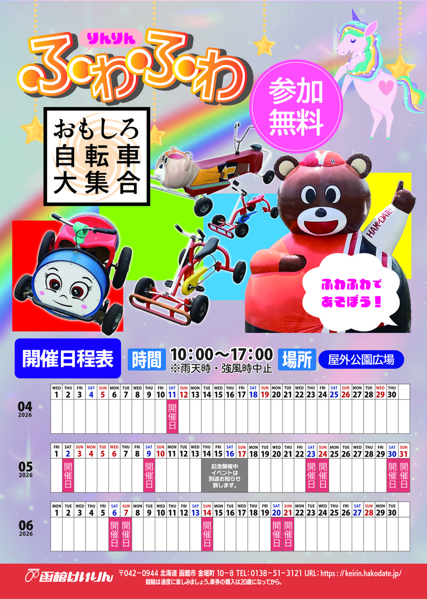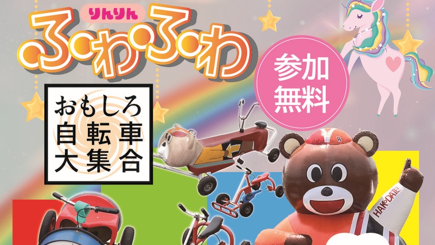 函館ナイター競輪の開催に合わせて、函館競輪キャラクター「りんりん」のエアー遊具(ふわふわ)や、ユニークな自転車で遊べる広場を開設する。参加無料。